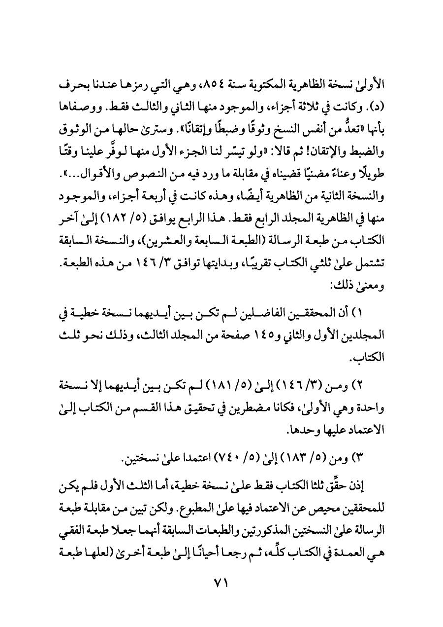 الأولى نسخة الظاهرية المكتوبة سنة ٨٥٤، وهي التي رمزها عندنا بحرف (د). وكانت في ثلاثة أجزاء، والموجود منها الثاني والثالث فقط. ووصفاها بأنها «تعدُّ من أنفس النسخ وثوقًا وضبطًا وإتقانًا». وسترى حالها من الوثوق والضبط والإتقان! ثم قالا: «ولو تيسّر لنا الجزء الأول منها لوفَّر علينا وقتًا طويلًا وعناءً مضنيًا قضيناه في مقابلة ما ورد فيه من النصوص والأقوال ... ». والنسخة الثانية من الظاهرية أيضًا، وهذه كانت في أربعة أجزاء، والموجود منها في الظاهرية المجلد الرابع فقط. هذا الرابع يوافق (٥/ ١٨٢) إلى آخر الكتاب من طبعة الرسالة (الطبعة السابعة والعشرين)، والنسخة السابقة تشتمل على ثلثي الكتاب تقريبًا، وبدايتها توافق ٣/ ١٤٦ من هذه الطبعة. ومعنى ذلك: