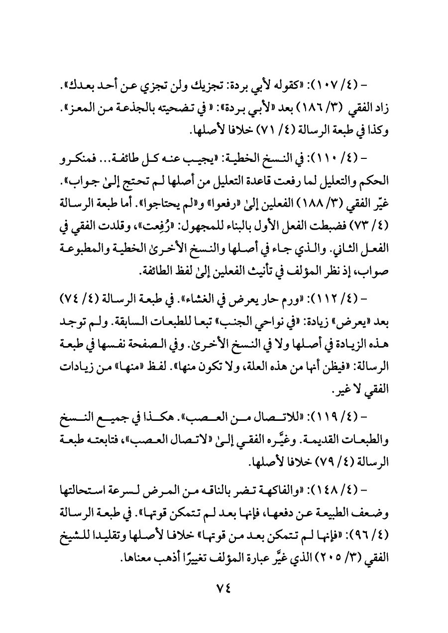 - (٤/ ١١٢): «ورم حار يعرض في الغشاء». في طبعة الرسالة (٤/ ٧٤) بعد «يعرض» زيادة: «في نواحي الجنب» تبعا للطبعات السابقة. ولم توجد هذه الزيادة في أصلها ولا في النسخ الأخرى. وفي الصفحة نفسها في طبعة الرسالة: «فيظن أنها من هذه العلة، ولا تكون منها». لفظ «منها» من زيادات الفقي لا غير.