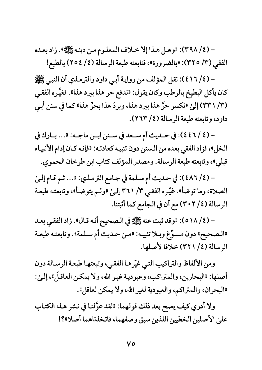 - (٤/ ٤٨٦): في حديث أم سلمة في جامع الترمذي: « ... ثم قام إلى الصلاة، وما توضأ». غيّره الفقي ٣/ ٣٦١ إلى «ولم يتوضأ»، وتابعته طبعة الرسالة (٤/ ٣٠٢) مع أن في الجامع كما أثبتنا.