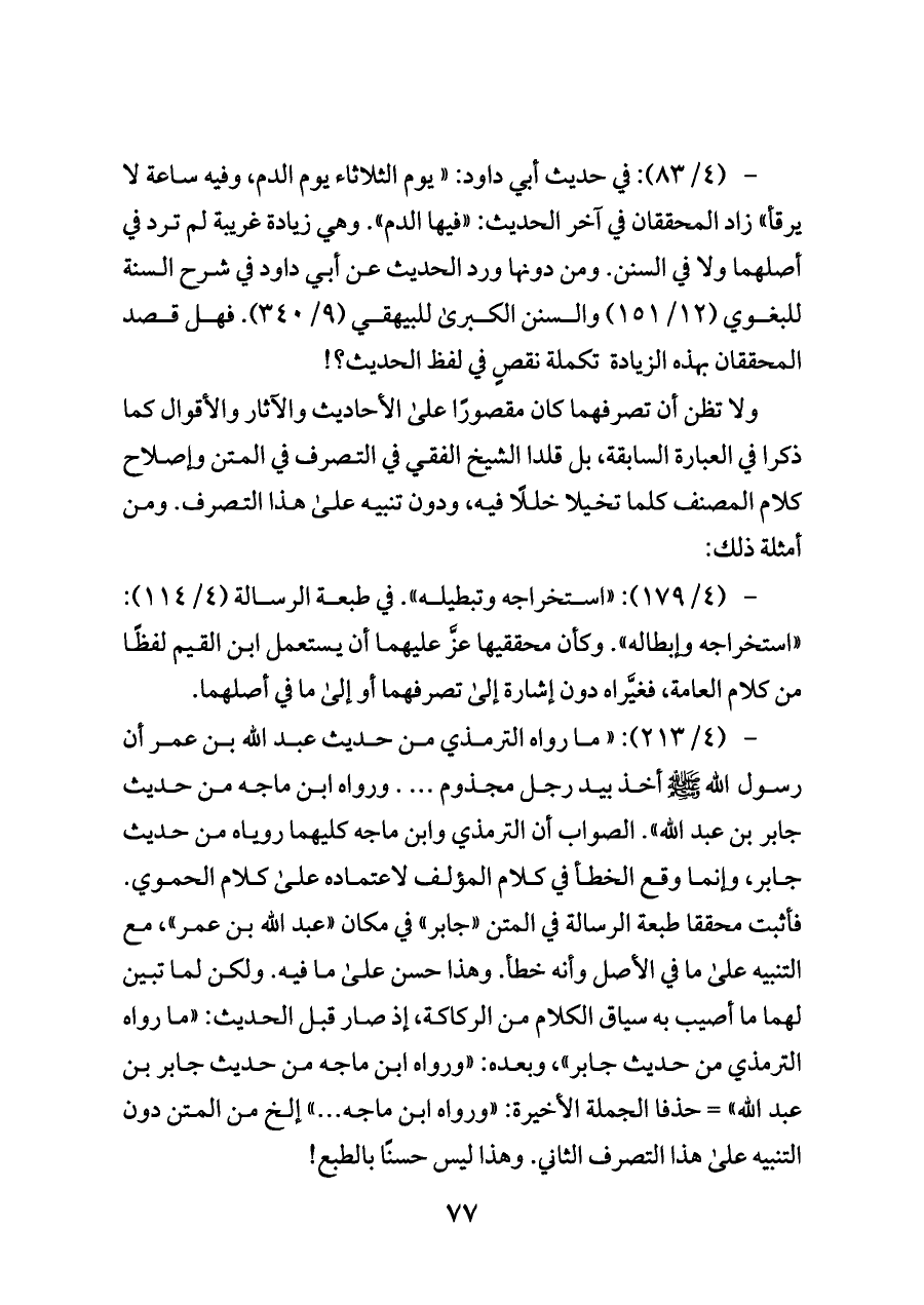 - (٤/ ٢١٣): «ما رواه الترمذي من حديث عبد الله بن عمر أن رسول الله - صلى الله عليه وسلم - أخذ بيد رجل مجذوم ... . ورواه ابن ماجه من حديث جابر بن عبد الله». الصواب أن الترمذي وابن ماجه كليهما روياه من حديث جابر، وإنما وقع الخطأ في كلام المؤلف لاعتماده على كلام الحموي. فأثبت محققا طبعة الرسالة في المتن «جابر» في مكان «عبد الله بن عمر»، مع التنبيه على ما في الأصل وأنه خطأ. وهذا حسن على ما فيه. ولكن لما تبين لهما ما أصيب به سياق الكلام من الركاكة، إذ صار قبل الحديث: «ما رواه الترمذي من حديث جابر»، وبعده: «ورواه ابن ماجه من حديث جابر بن عبد الله» = حذفا الجملة الأخيرة: «ورواه ابن ماجه ... » إلخ من المتن دون التنبيه على هذا التصرف الثاني. وهذا ليس حسنًا بالطبع!