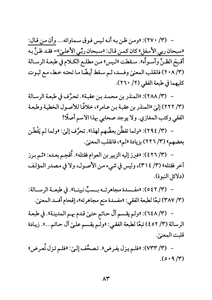 - (٣/ ٥٤٢): «مفسدة مجاهرته بسبِّ نبينا». في طبعة الرسالة: (٣/ ٣٨٧) تبعًا لطبعة الفقي: «مفسدة منع مجاهرته»، إقحام أفسد المعنى.