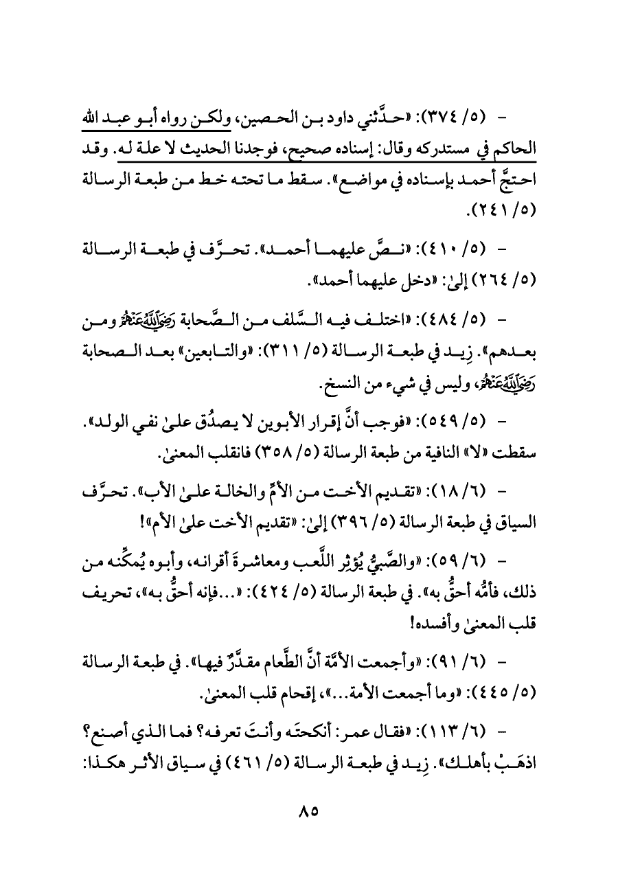 - (٥/ ٥٤٩): «فوجب أنَّ إقرار الأبوين لا يصدُق على نفي الولد». سقطت «لا» النافية من طبعة الرسالة (٥/ ٣٥٨) فانقلب المعنى.