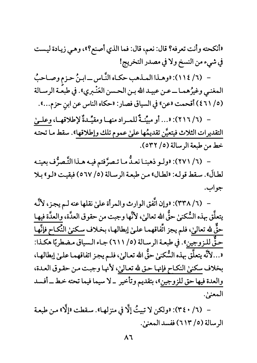 - (٦/ ١١٤): «وهذا المذهب حكاه النَّاس ــ ابنُ حزمٍ وصاحبُ المغني وغيرُهما ــ عن عبيد الله بن الحسن العَنْبري». في طبعة الرسالة (٥/ ٤٦١) أقحمت «عن» في السياق فصار: «حكاه الناس عن ابنِ حزم ... ».