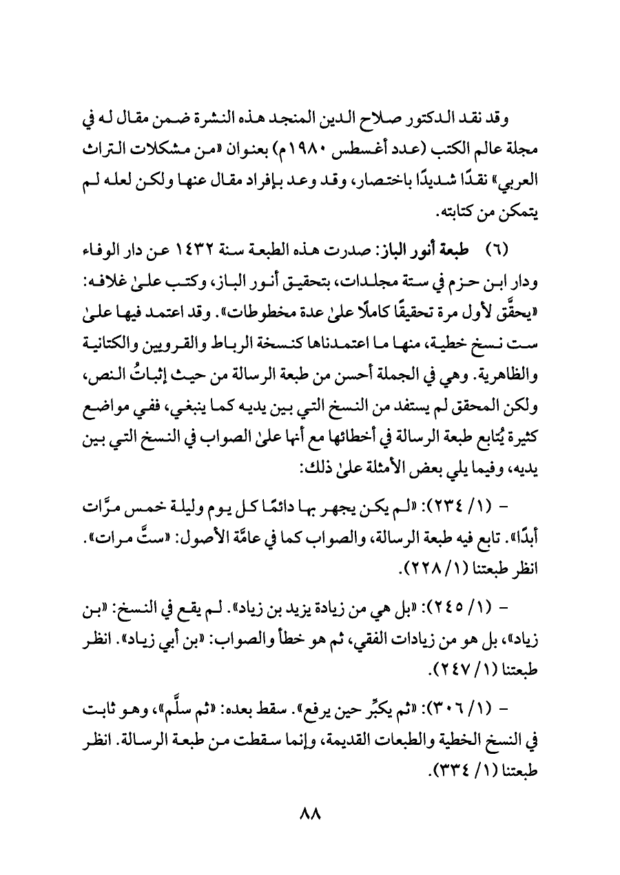 (٦) طبعة أنور الباز: صدرت هذه الطبعة سنة ١٤٣٢ عن دار الوفاء ودار ابن حزم في ستة مجلدات، بتحقيق أنور الباز، وكتب على غلافه: «يحقَّق لأول مرة تحقيقًا كاملًا على عدة مخطوطات». وقد اعتمد فيها على ست نسخ خطية، منها ما اعتمدناها كنسخة الرباط والقرويين والكتانية والظاهرية. وهي في الجملة أحسن من طبعة الرسالة من حيث إثباتُ النص، ولكن المحقق لم يستفد من النسخ التي بين يديه كما ينبغي، ففي مواضع كثيرة يُتابع طبعة الرسالة في أخطائها مع أنها على الصواب في النسخ التي بين يديه، وفيما يلي بعض الأمثلة على ذلك: