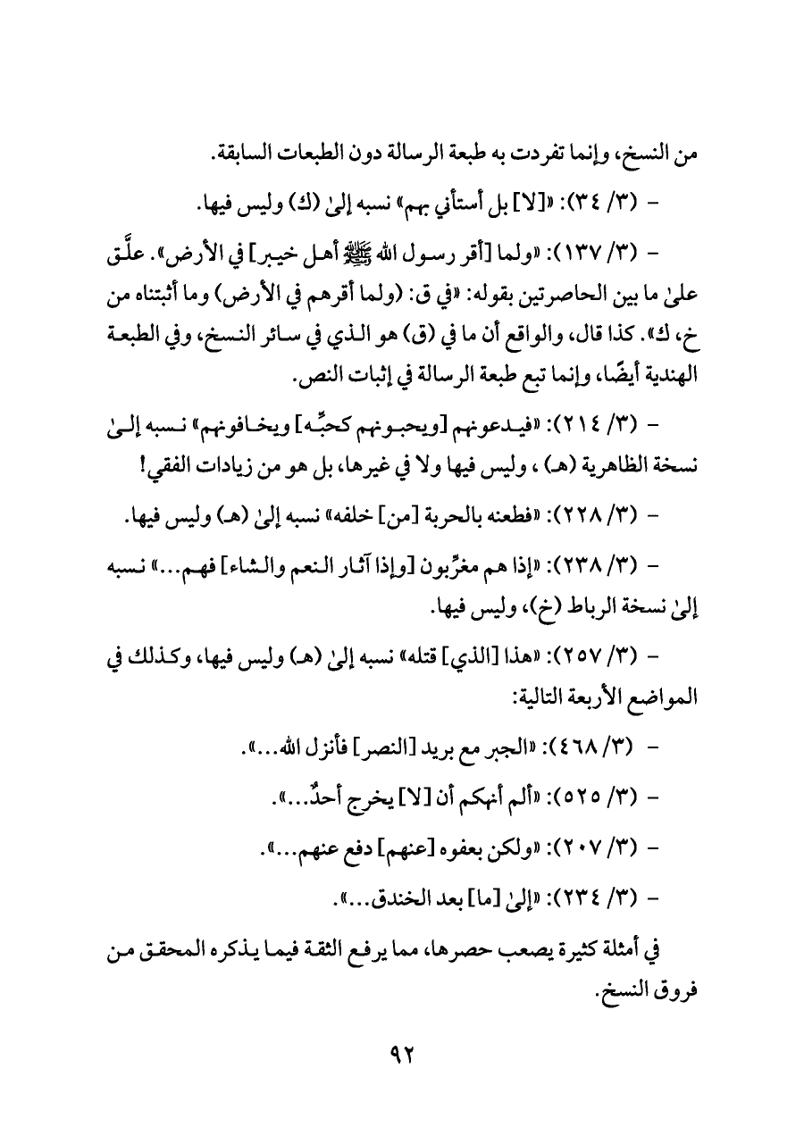 - (٣/ ١٣٧): «ولما [أقر رسول الله - صلى الله عليه وسلم - أهل خيبر] في الأرض». علَّق على ما بين الحاصرتين بقوله: «في ق: (ولما أقرهم في الأرض) وما أثبتناه من خ، ك». كذا قال، والواقع أن ما في (ق) هو الذي في سائر النسخ، وفي الطبعة الهندية أيضًا، وإنما تبع طبعة الرسالة في إثبات النص.