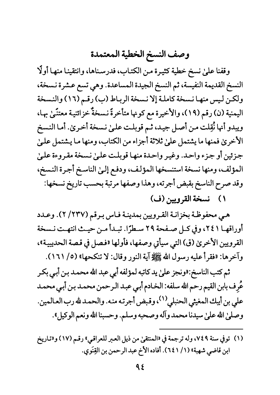 هي محفوظة بخزانة القرويين بمدينة فاس برقم (٢٣٧/ ٢). وعدد أوراقها ٢٤١، وفي كل صفحة ٢٩ سطرًا. تبدأ من حيث انتهت نسخة القرويين الأخرى (ق) التي سيأتي وصفها، فأولها «فصل في قصة الحديبية»، وآخرها: «فقرأ عليه رسول الله - صلى الله عليه وسلم - آية النور وقال: لا تنكحها» (٥/ ١٦١).