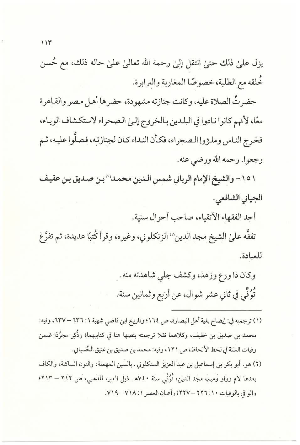١٥١ - والشيخ الإمام الرباني شمس الدين محمد (¬١) بن صديق بن عفيف الجياني الشافعي.