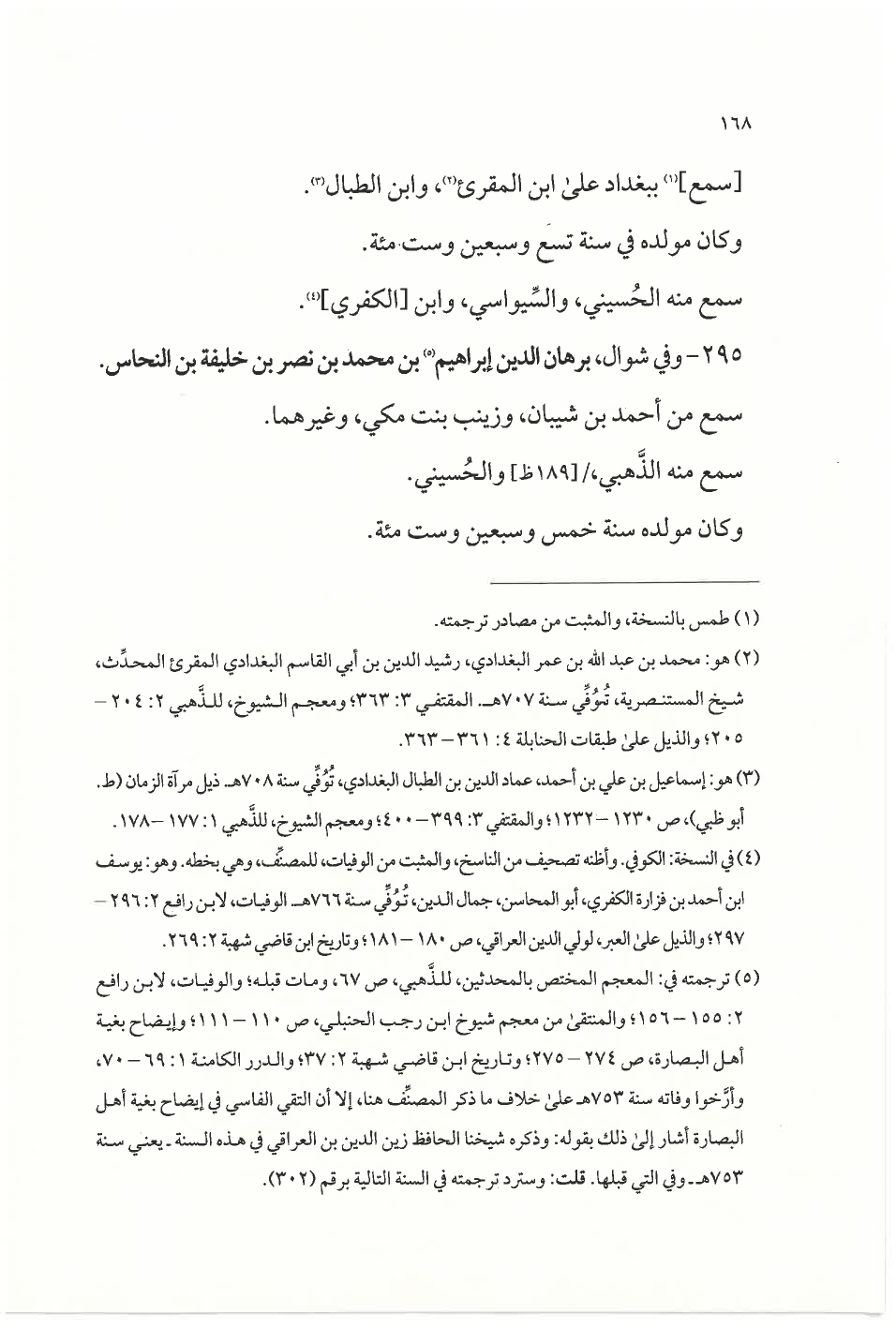 (¬٥) ترجمته في: المعجم المختص بالمحدثين، للذهبي، ص ٦٧، ومات قبله؛ والوفيات، لابن رافع ٢: ١٥٥ - ١٥٦؛ والمُنتَقَى من معجم شيوخ ابن رجب الحنبلي، ص ١١٠ - ١١١؛ وإيضاح بغية أهل البصارة، ص ٢٧٤ - ٢٧٥؛ وتاريخ ابن قاضي شهبة ٢: ٣٧؛ والدرر الكامنة ١: ٦٩ - ٧٠، وأرَّخوا وفاته سنة ٧٥٣ هـ على خلاف ما ذكر المصنِّف هنا، إلَّا أن التقي الفاسي في إيضاح بغية أهل البصارة أشار إلى ذلك بقوله: وذكره شيخنا الحافظ زين الدين بن العراقي في هذه السنة- يعني سنة ٧٥٣ هـ- وفي التي قبلها. قلت: وسترد ترجمته في السنة التالية برقم (٣٠٢).