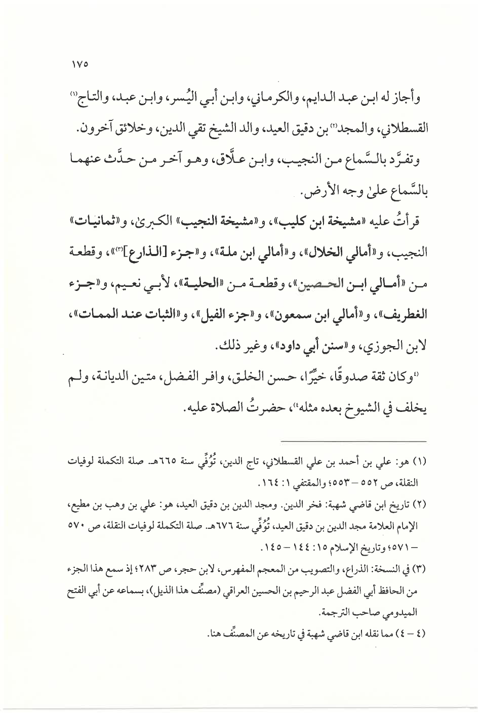 (¬١) هو: علي بن أحمد بن علي القسطلاني، تاج الدين، تُوُفِّي سنة ٦٦٥ هـ. صلة التكملة لوفيات النقلة، ص ٥٥٢ - ٥٥٣؛ والمقتفي ١: ١٦٤.