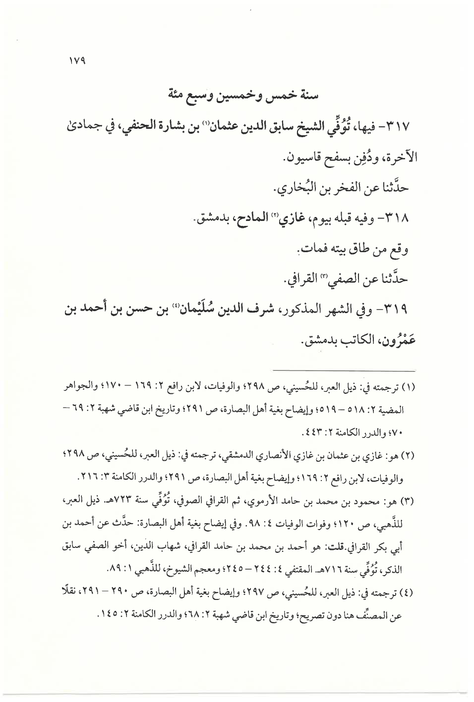 ٣١٧ - فيها، تُوُفِّي الشيخ سابق الدين عثمان (¬١) بن بشارة الحنفي، في جمادى الآخرة، ودُفِن بسفح قاسيون.
