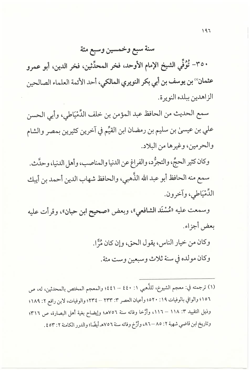 ٣٥٠ - تُوُفِّي الشيخ الإمام الأوحد، فخر المحدِّثين، فخر الدين، أبو عمرو عثمان (¬١) بن يوسف بن أبي بكر النويري المالكي، أحد الأئمة العلماء الصالحين الزاهدين ببلدة النويرة.