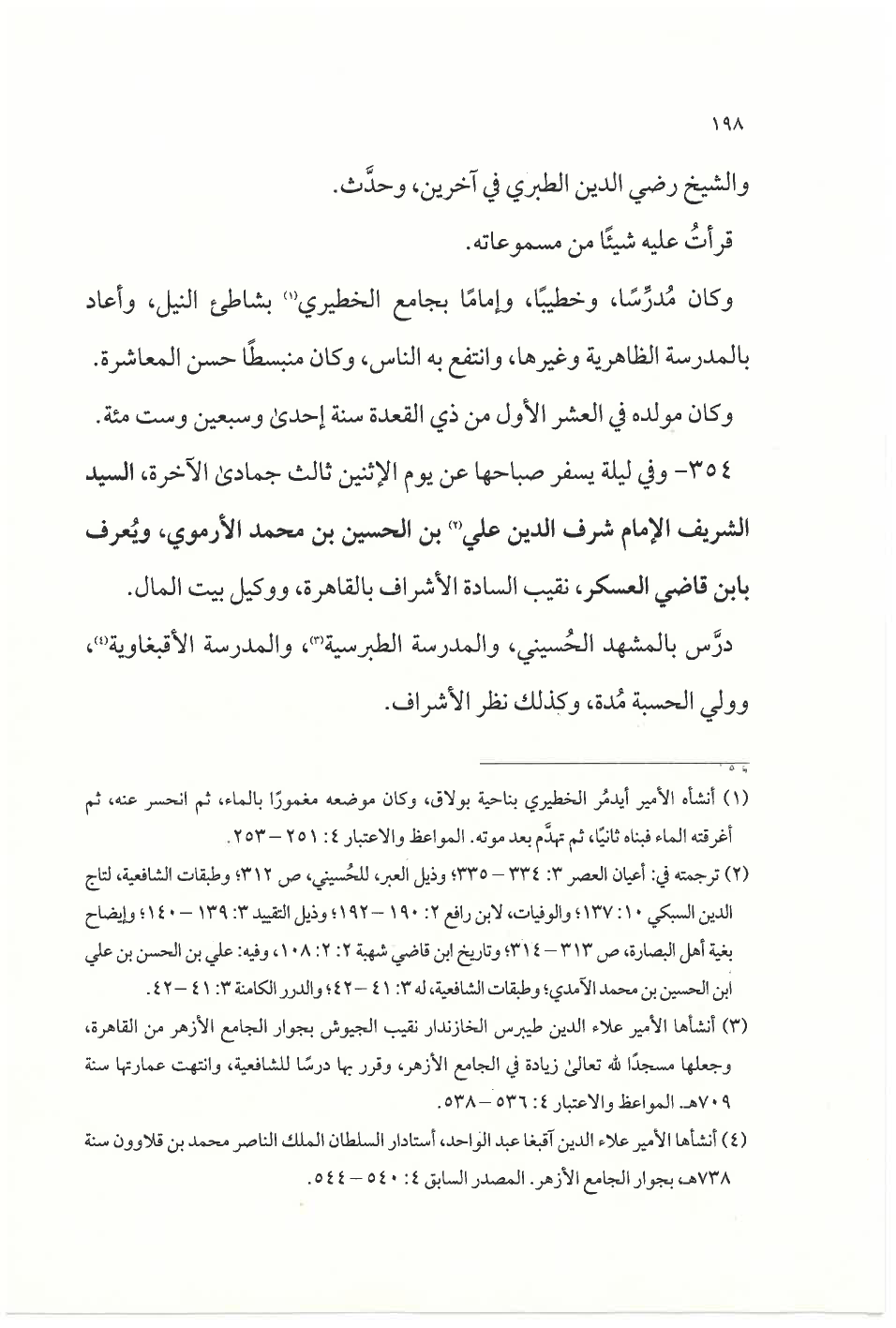 ٣٥٤ - وفي ليلة يسفر صباحها عن يوم الإثنين ثالث جمادى الآخرة، السيد الشريف الإمام شرف الدين علي (¬٢) ابن الحسين بن محمد الأرموي، ويُعرف بابن قاضي العسكر، نقيب السادة الأشراف بالقاهرة، ووكيل بيت المال.