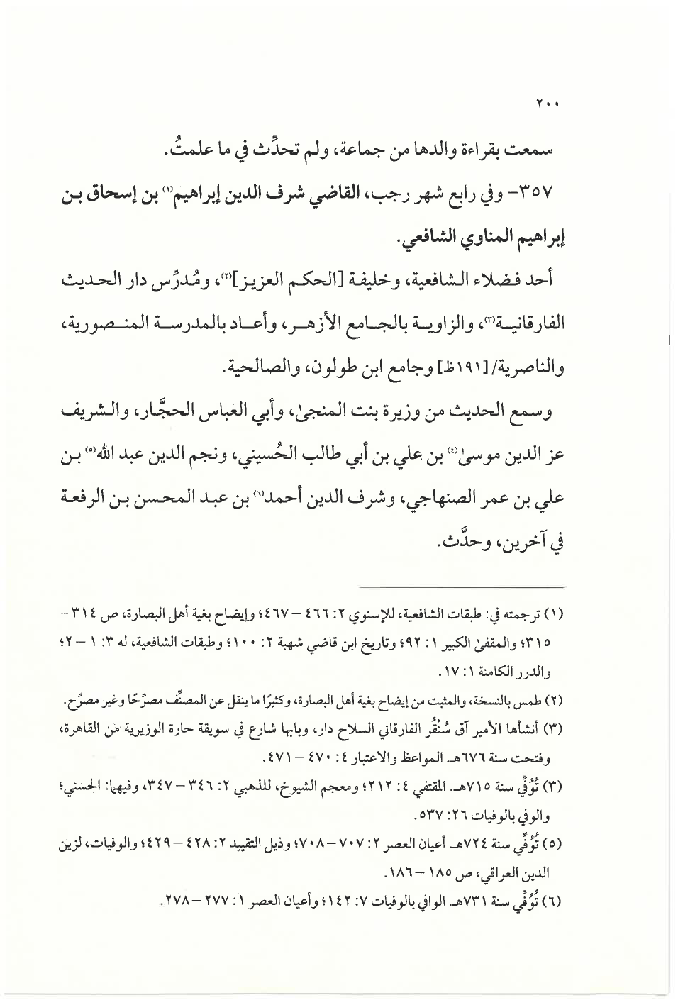 ٣٥٧ - وفي رابع شهر رجب، القاضي شرف الدين إبراهيم (¬١) بن إسحاق بن إبراهيم المناوي الشافعي.