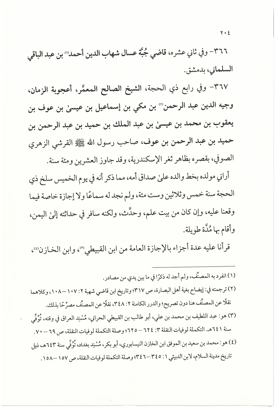٣٦٧ - وفي رابع ذي الحجة، الشيخ الصالح المعمَّر، أعجوبة الزمان، وجيه الدين عبد الرحمن (¬٢) بن مكي بن إسماعيل بن عيسى بن عوف بن يعقوب بن محمد بن عيسى بن عبد الملك بن حميد بن عبد الرحمن ابن حميد بن عبد الرحمن بن عوف، صاحب رسول الله - صلى الله عليه وسلم - القرشي الزهري الصوفي، بقصره بظاهر ثغر الإسكندرية، وقد جاوز العشرين ومئة سنة.