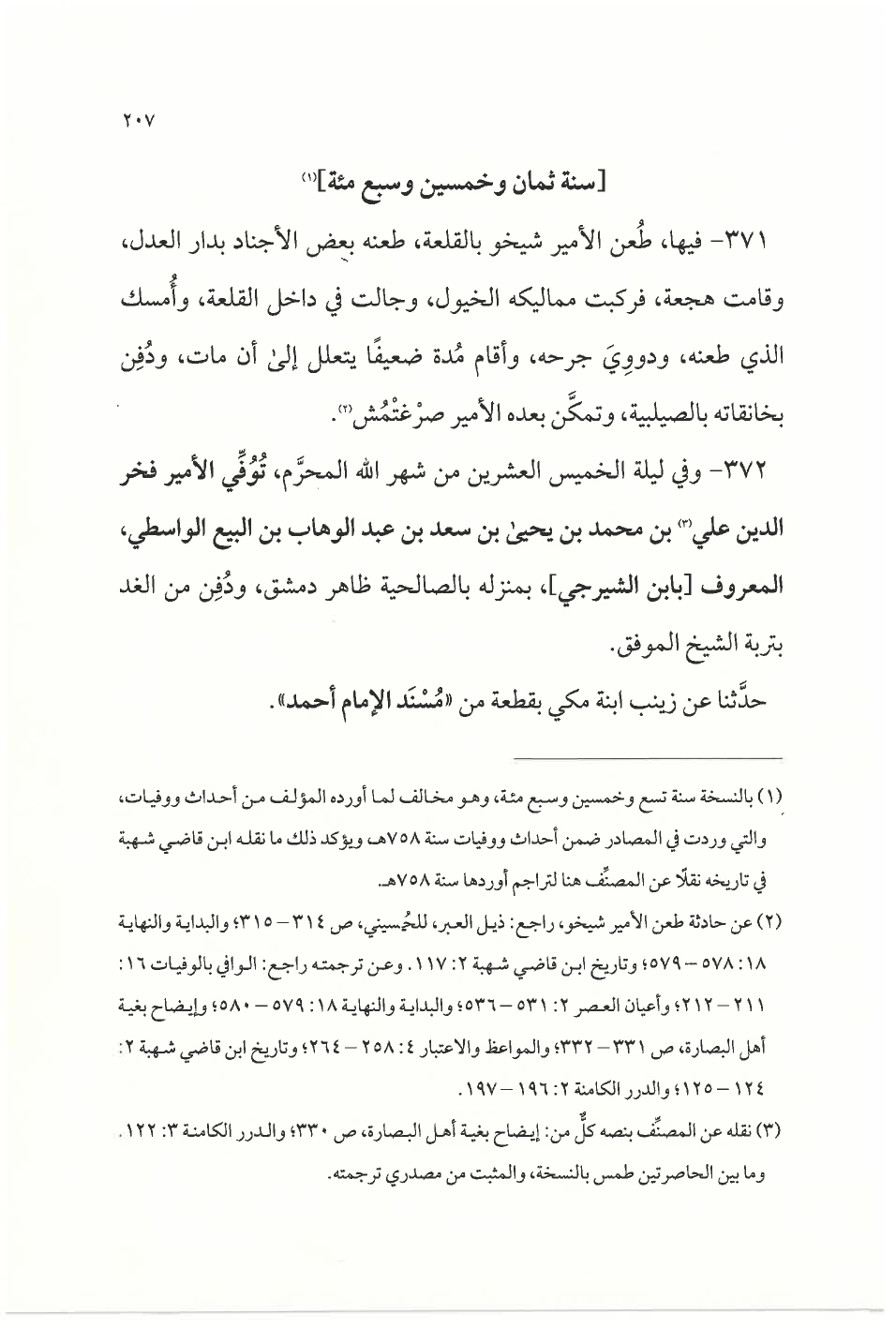(¬٢) عن حادثة طعن الأمير شيخو، راجع: ذيل العبر، للحسيني، ص ٣١٤ - ٣١٥؛ والبداية والنهاية ١٨: ٥٧٨ - ٥٧٩؛ وتاريخ ابن قاضي شهبة ٢: ١١٧. وعن ترجمته راجع: الوافي بالوفيات ١٦: ٢١١ - ٢١٢؛ وأعيان العصر ٢: ٥٣١ - ٥٣٦؛ والبداية والنهاية ١٨: ٥٧٩ - ٥٨٠؛ وإيضاح بغية أهل البصارة، ص ٣٣١ - ٣٣٢؛ والمواعظ والاعتبار ٤: ٢٥٨ - ٢٦٤؛ وتاريخ ابن قاضي شهبة ٢: ١٢٤ - ١٢٥؛ والدرر الكامنة ٢: ١٩٦ - ١٩٧.