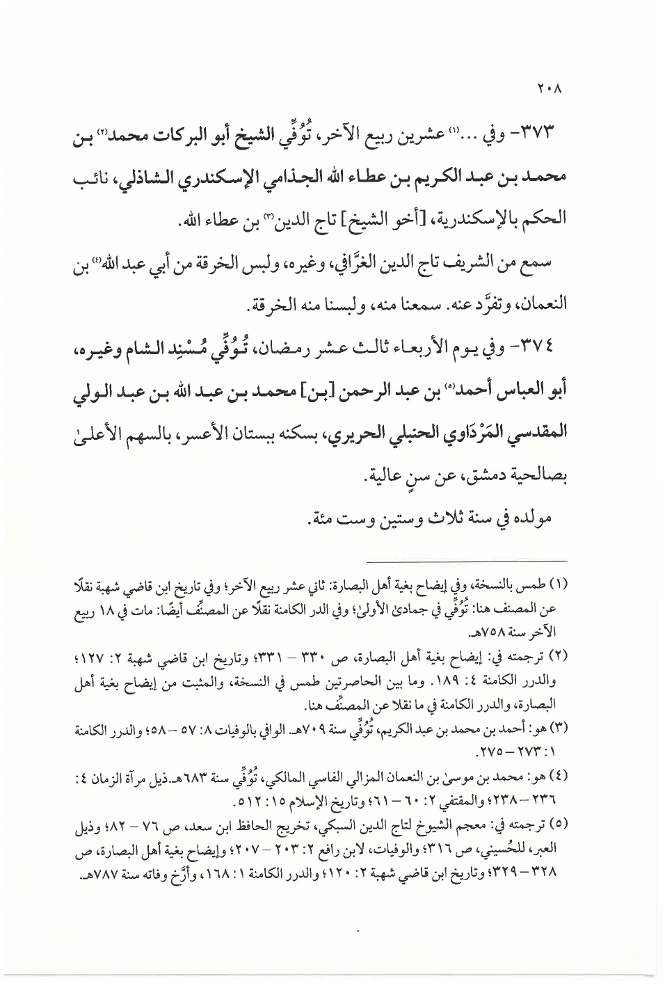 (¬٥) ترجمته في: معجم الشيوخ لتاج الدين السبكي، تخريج الحافظ ابن سعد، ص ٧٦ - ٨٢؛ وذيل العبر، للحسيني، ص ٣١٦؛ والوفيات، لابن رافع ٢: ٢٠٣ - ٢٠٧؛ إيضاح بغية أهل البصارة، ص ٣٢٨ - ٣٢٩؛ وتاريخ ابن قاضي شهبة ٢: ١٢٠؛ والدرر الكامنة ١: ١٦٨، وأرَّخ وفاته سنة ٧٨٧ هـ.