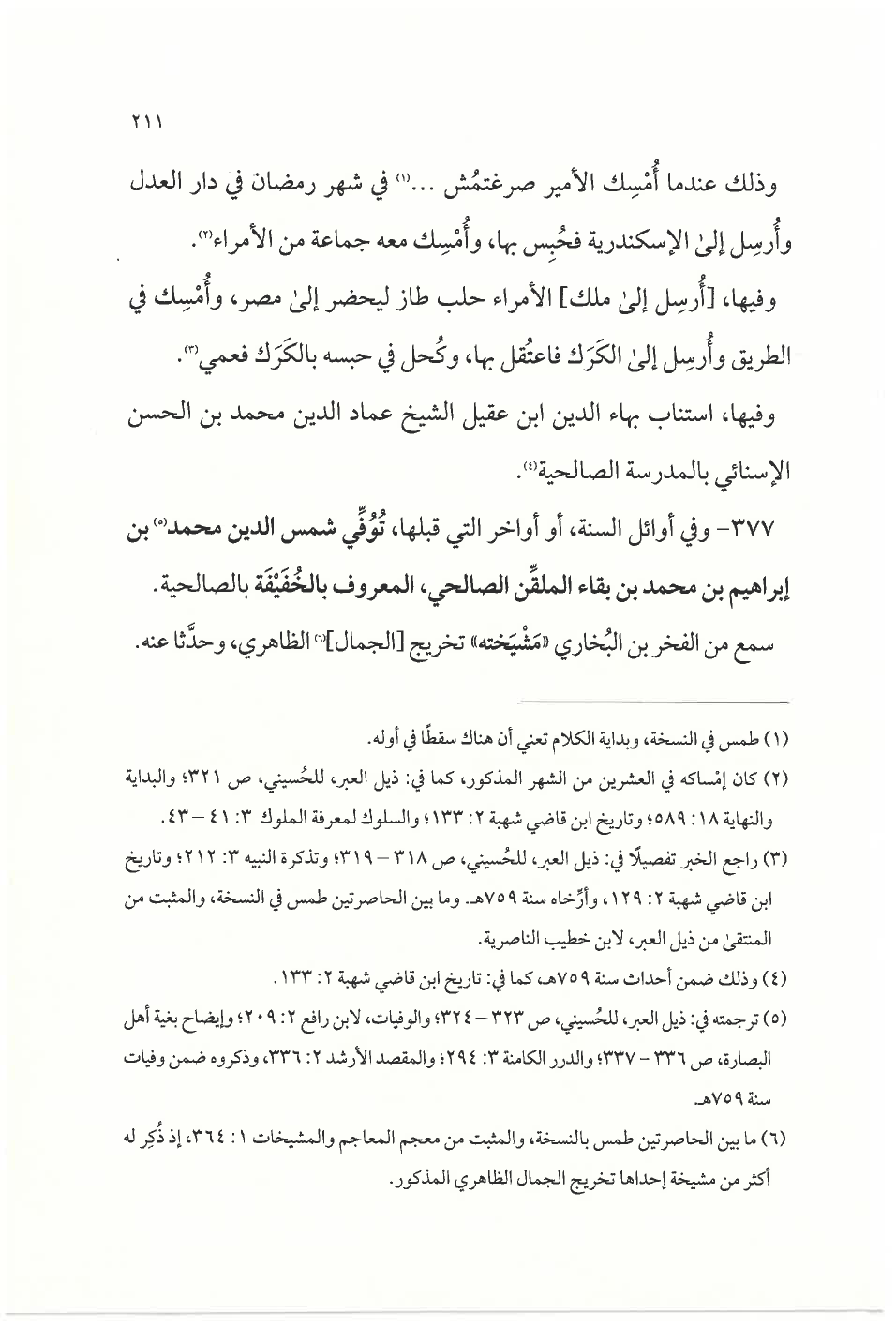 (¬٣) راجع الخبر تفصيلًا: ذيل العبر، للحسيني، ص ٣١٨ - ٣١٩؛ وتذكرة النبيه ٣: ٢١٢؛ وتاريخ ابن قاضي شهبة ٢: ١٢٩، وأرَّخاه سنى ٧٥٩ هـ. وما بين الحاصرتين طمس في النسخة، والمثبت من المُنتَقَى من ذيل العبر، لابن خطيب الناصرية.