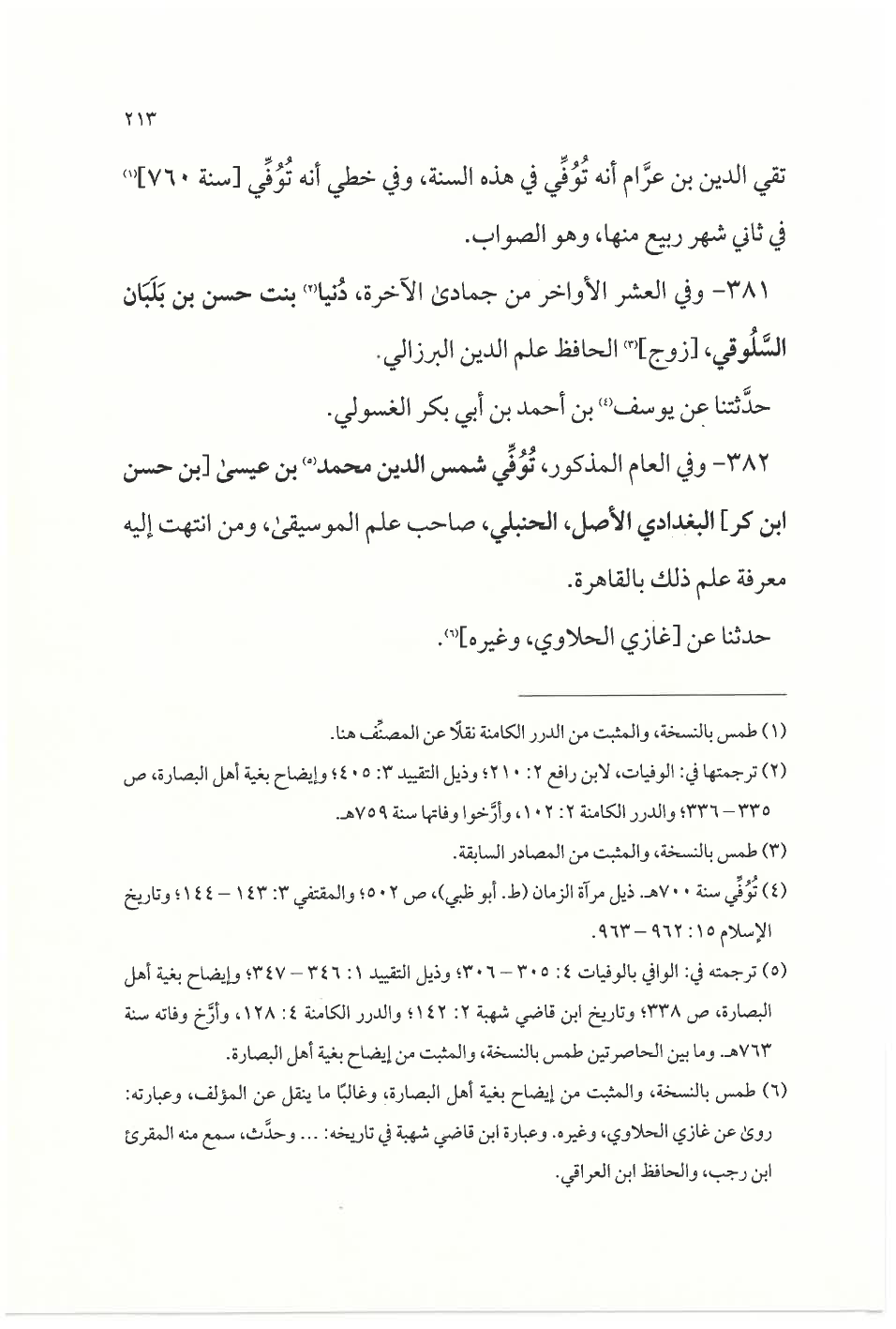 (¬٥) ترجمته في: الوافي بالوفيات ٤: ٣٠٥ - ٣٠٦؛ وذيل التقييد ١: ٣٤٦ - ٣٤٧؛ وإيضاح بغية أهل البصارة، ص ٣٣٨؛ وتاريخ ابن قاضي شهبة ٢: ١٤٢؛ والدرر الكامنة ٤: ١٢٨، وأرَّخ وفاته سنة ٧٦٣ هـ. وما بين الحاصرتين طمس بالنسخة، والمثبت من إيضاح بغية أهل البصارة.
