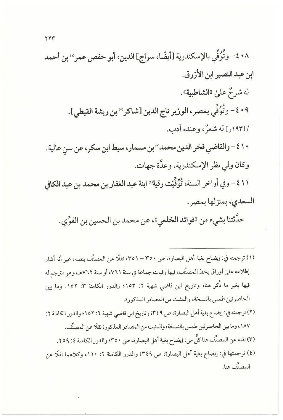 (¬١) ترجمته في: إيضاح بغية أهل البصارة، ص ٣٥٠ - ٣٥١، نقلًا عن المصنِّف بنصِّه، غير أنه أشار إطلاعه على أوراق بخط المصنِّف، فيها وفيَّات جماعة في سنة ٧٦١، أو سنة ٧٦٢ هـ، وهو مترجم له فيها بغير ما ذُكِر هنا؛ وتاريخ ابن قاضي شهبة ٢: ١٥٣؛ والدرر الكامنة ٣: ١٥٢. وما بين الحاصرتين طمس بالنسخة، والمثبت من المصادر المذكورة.