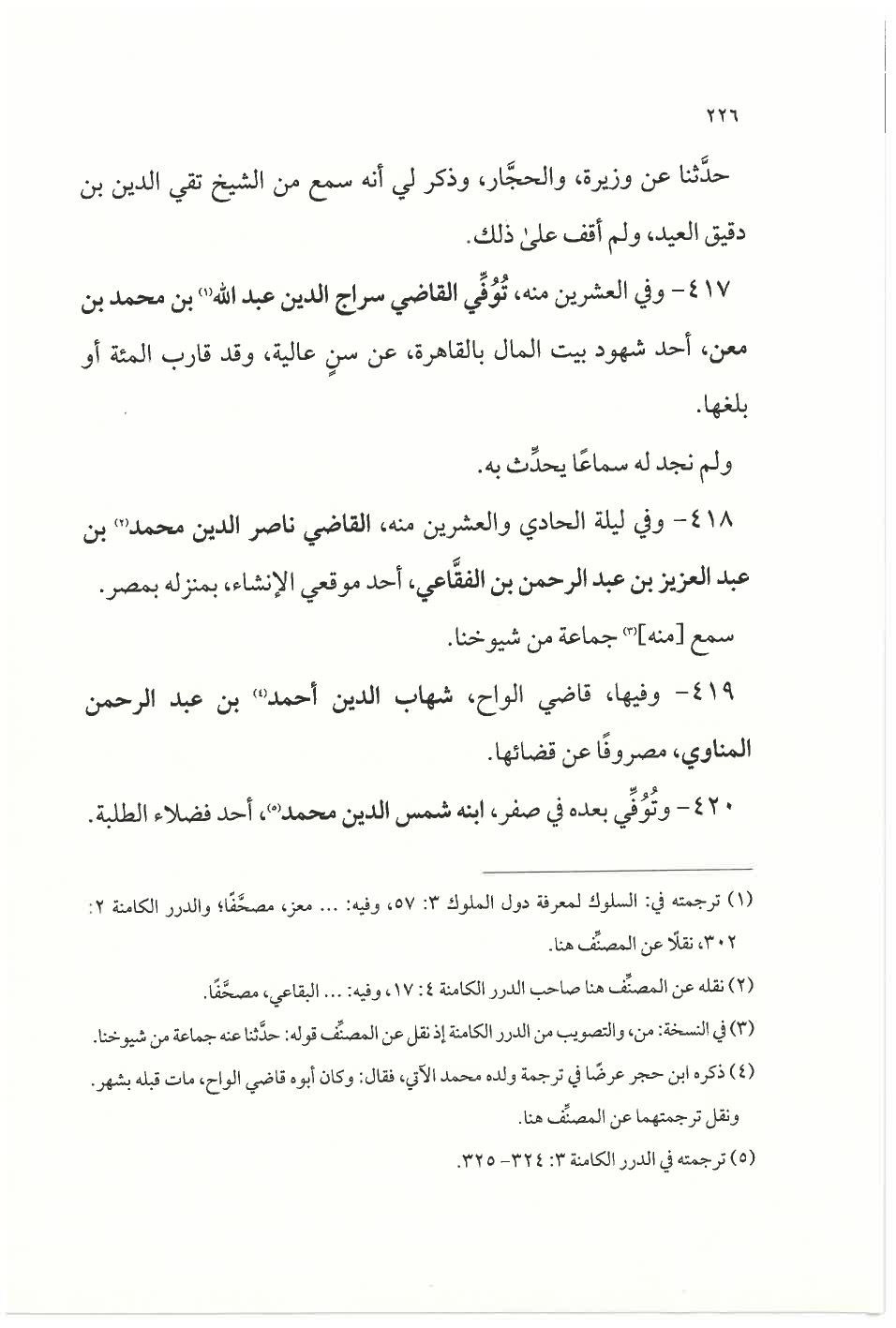 ٤١٧ - وفي العشرين منه، تُوُفِّي القاضي سراج الدين عبد الله (¬١) بن محمد بن معن، أحد شهود بيت المال بالقاهرة، عن سنٍّ عالية، وقد قارب المئة أو بلغها.