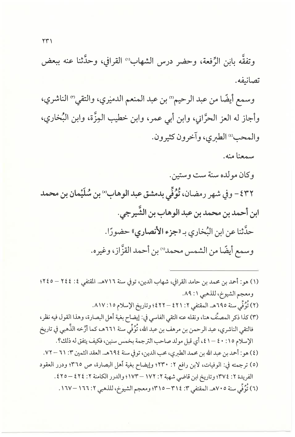 (¬١) هو: أحمد بن محمد بن حامد القرافي، شهاب الدين، تُوُفِّي سنة ٧١٦ هـ. المقتفي ٤: ٢٤٤ - ٢٤٥؛ ومعجم الشيوخ، للذهبي ١: ٨٩.