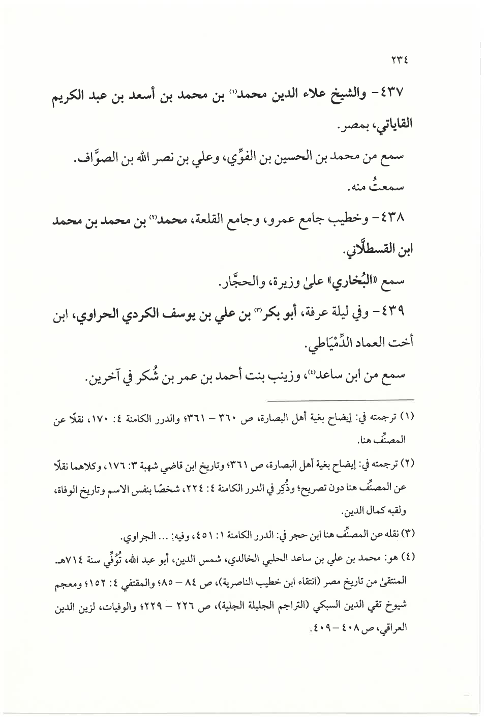 (¬٤) هو: محمد بن علي بن ساعد الحلبي الخالدي، شمس الدين، أبو عبد الله، تُوُفِّي سنة ٧١٤ هـ. المُنتَقَى من تاريخ مصر (انتقاء ابن خطيب الناصرية)، ص ٨٤ - ٨٥؛ والمقتفي ٤: ١٥٢؛ ومعجم شيوخ تقي الدين السبكي (التراجم الجليلة الجلية)، ص ٢٢٦ - ٢٢٧؛ والوفيات، لزين الدين العراقي، ص ٤٠٨ - ٤٠٩.