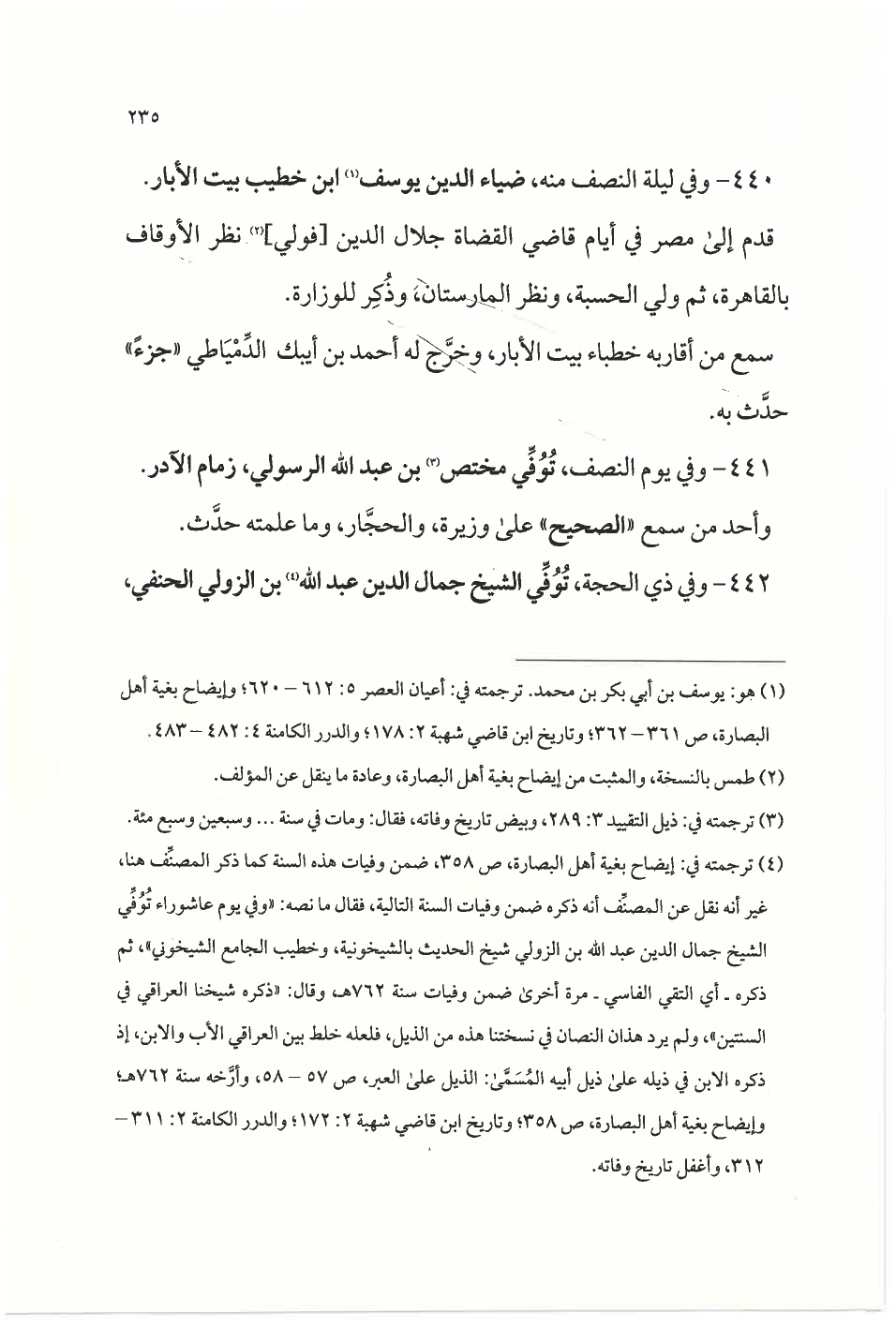 (¬٤) ترجمته في: إيضاح بغية أهل البصارة، ص ٣٥٨، ضمن وفيات هذه السنة كما ذكر المصنِّف هنا، غير أنه نقل عن المصنِّف أنه ذكره ضمن وفيات السنة التالية، فقال ما نصه: «وفي يوم عاشوراء تُوفِّي الشيخ جمال الدين عبد الله بن الزولي شيخ الحديث بالشيخونية، وخطيب الجامع الشيخوني»، ثم ذكره- أي التقي الفاسي- مرة أخرى ضمن وفيات سنة ٧٦٢ هـ، وقال: «ذكره شيخنا العراقي في السنتين»، ولم يرد هذان النصان في نسختنا هذه من الذيل، فلعله خلط بين العراقي الأب والابن، إذ ذكره الابن في ذيله على ذيل أبيه المُسَمَّى: الذيل على العبر، ص ٥٧ - ٥٨، وأرَّخه سنة ٧٦٢ هـ؛ وإيضاح بغية أهل البصارة، ص ٣٥٨؛ وتاريخ ابن قاضي شهبة ٢: ١٧٢؛ والدرر الكامنة ٢: ٣١١ - ٣١٢، وأغفل تاريخ وفاته.