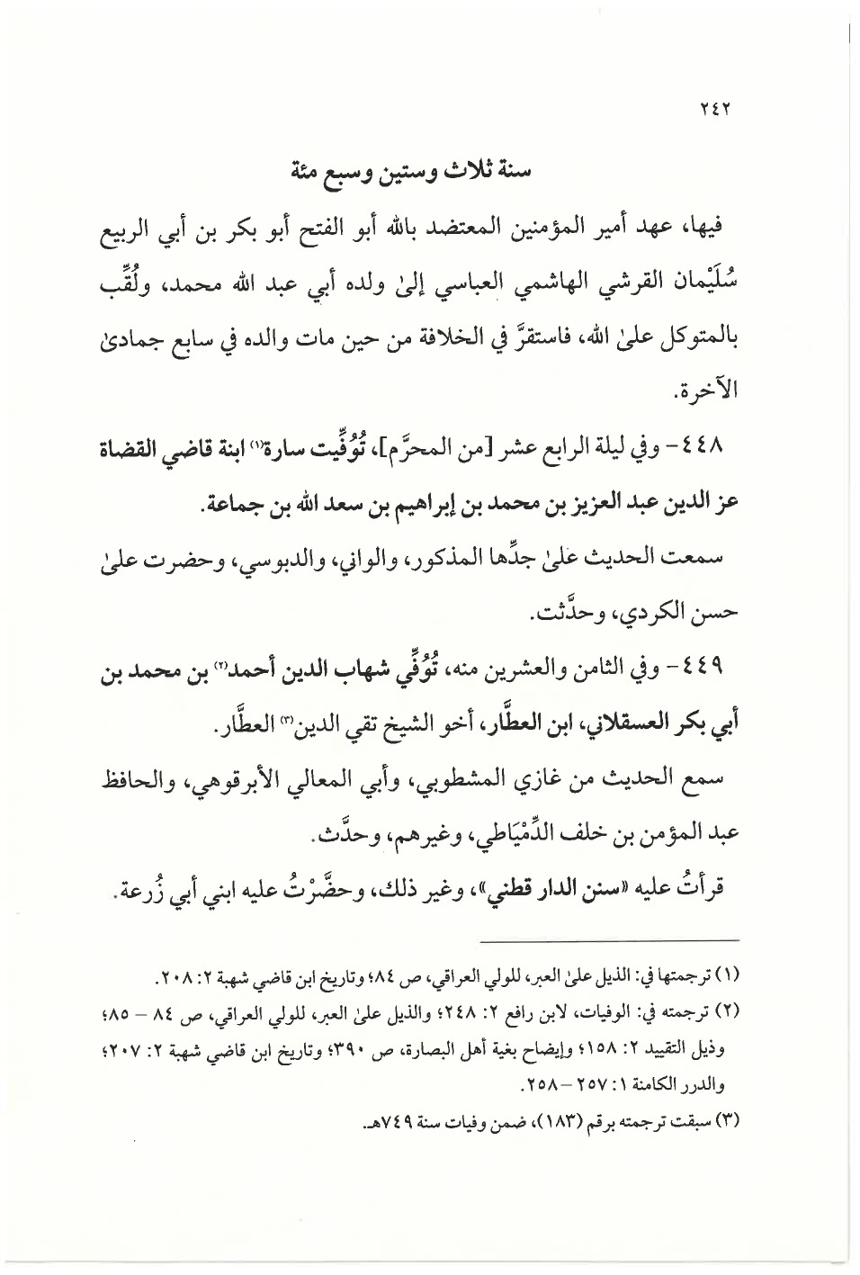 ٤٤٨ - وفي ليلة الرابع عشر [من المحرَّم]، تُوُفِّيت سارة (¬١) ابنة قاضي القضاة عز الدين عبد العزيز بن محمد ابن إبراهيم بن سعد الله بن جماعة.