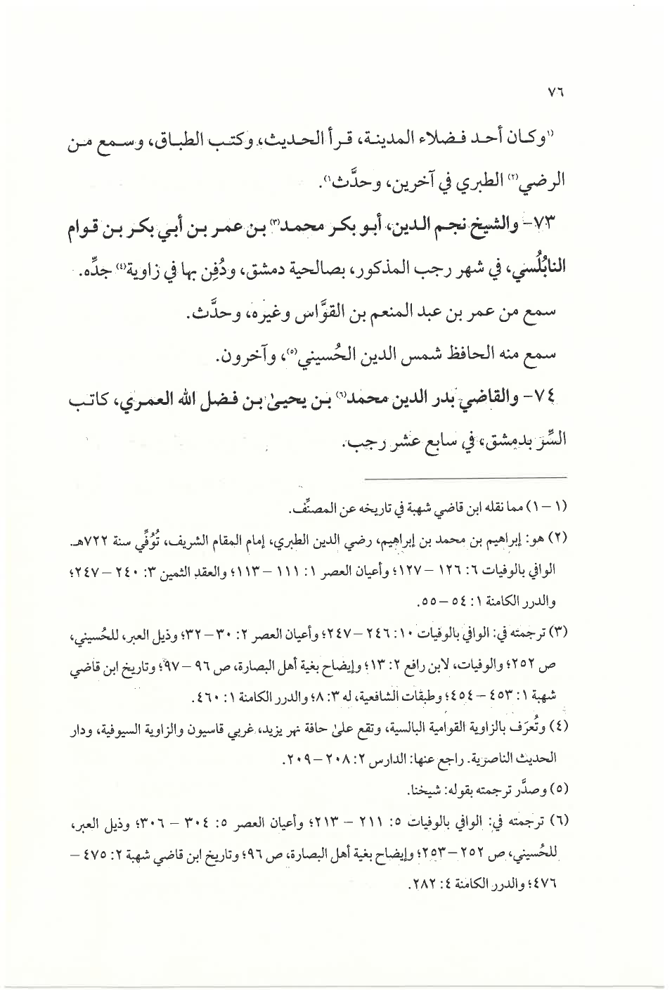 ٧٣ - والشيخ نجم الدين، أبو بكر محمد (¬٣) بن عمر بن أبي بكر بن قوام النابُلُسي، في شهر رجب المذكور، بصالحية دمشق، ودُفِن بها في زاوية (¬٤) جدِّه.