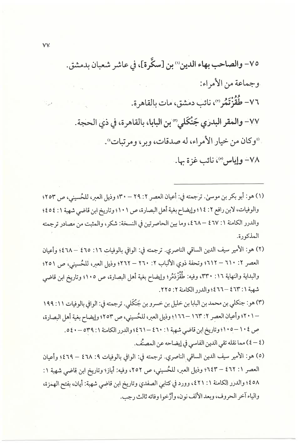 ٧٧ - والمقر البدري جَنْكَلي (¬٣) بن البابا، بالقاهرة، في ذي الحجة. (¬٤) وكان من خيار الأمراء، له صدقات، وبر، ومرتبات ٥).