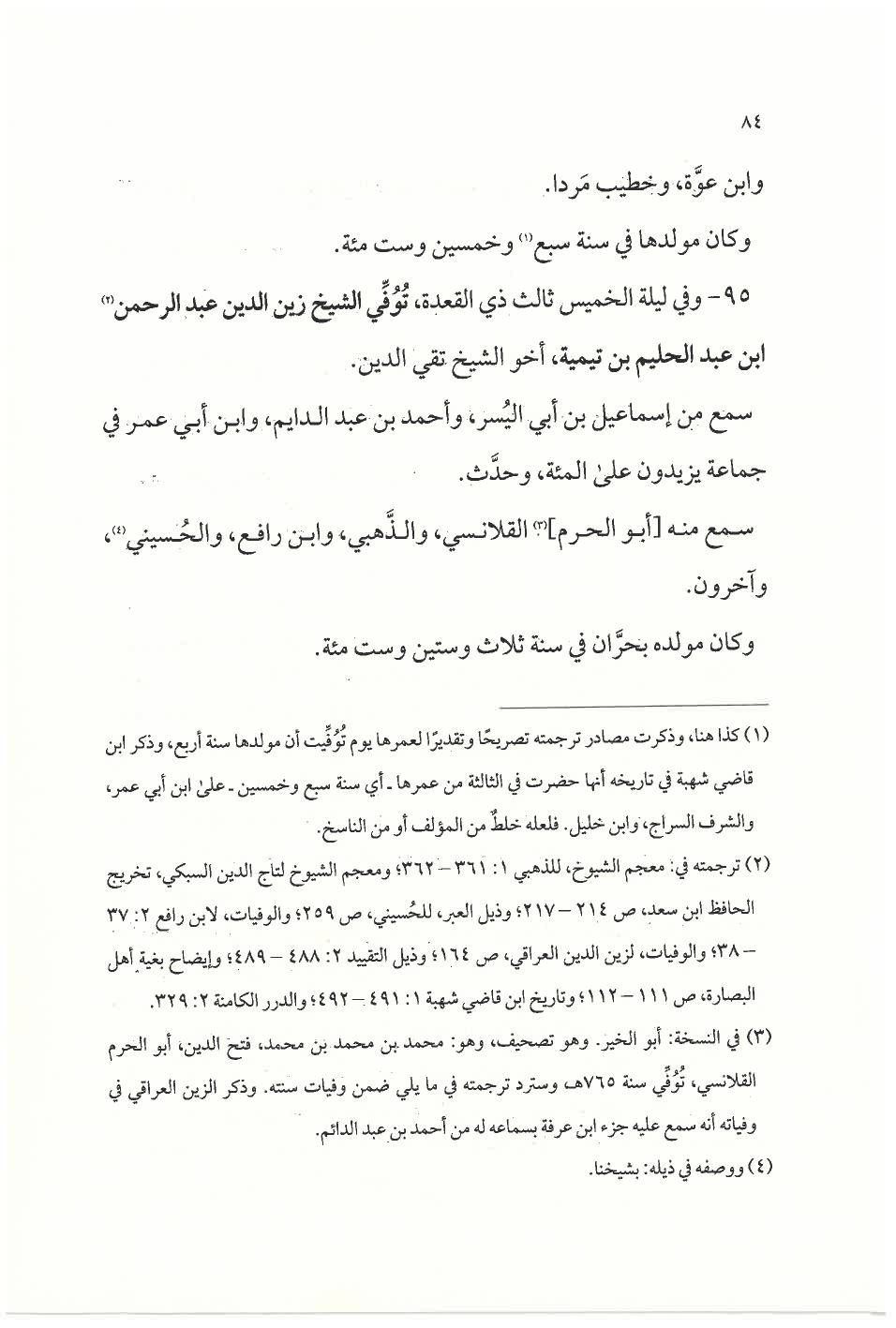 ٩٥ - وفي ليلة الخميس ثالث ذي القعدة، تُوُفِّي الشيخ زين الدين عبد الرحمن (¬٢) ابن عبد الحليم بن تيمية، أخو الشيخ تقي الدين.