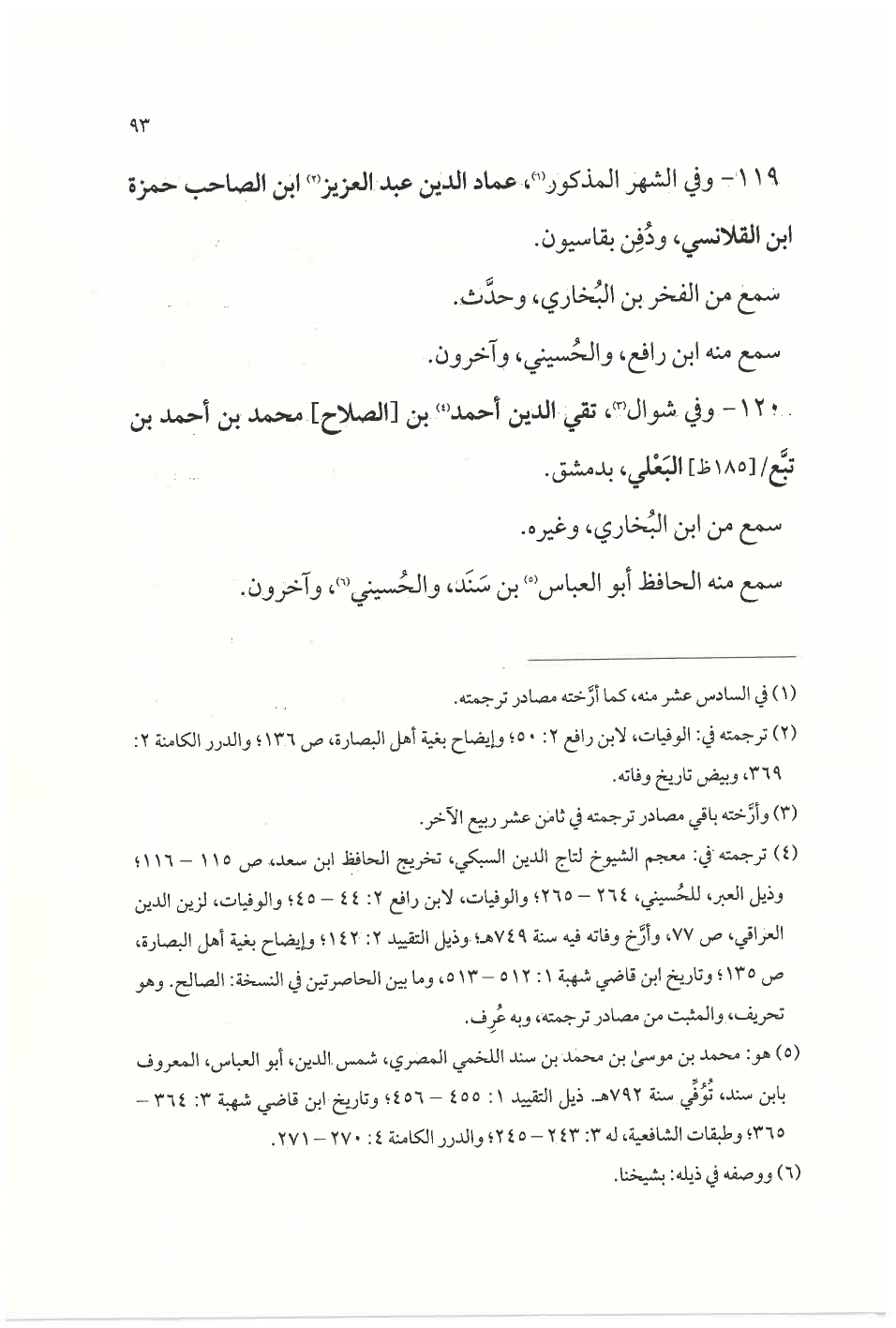 ١١٩ - وفي الشهر المذكور (¬١)، عماد الدين عبد العزيز (¬٢) ابن الصاحب حمزة بن القلانسي، ودُفِن بقاسيون.