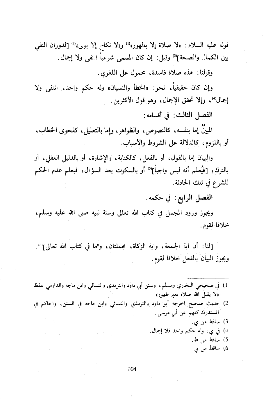 قَوْلِهِ عَلَيْهِ السَّلَامُ لَا صَلَاةَ إِلَّا بِطَهُورٍ وَلَا نِكَاحَ إِلَّا بِوَلِيٍّ لِدَوَرَانِ النَّفْيِ بَيْنَ الْكَمَالِ وَالصِّحَّةِ وَقِيلَ إِنْ كَانَ الْمُسَمَّى شَرْعِيًّا انْتَفَى وَلَا إِجْمَالَ وَقَوْلُنَا هَذِهِ صَلَاةٌ فَاسِدَةٌ مَحْمُولٌ عَلَى اللُّغَوِيِّ وَإِنْ كَانَ حَقِيقِيًّا نَحْوَ الْخَطَأِ وَالنِّسْيَانِ وَلَهُ حُكْمٌ وَاحِدٌ انْتَفَى وَلَا إِجْمَالَ وَإِلَّا تَحَقَّقَ الْإِجْمَالُ وَهُوَ قَوْلُ الْأَكْثَرِينَ