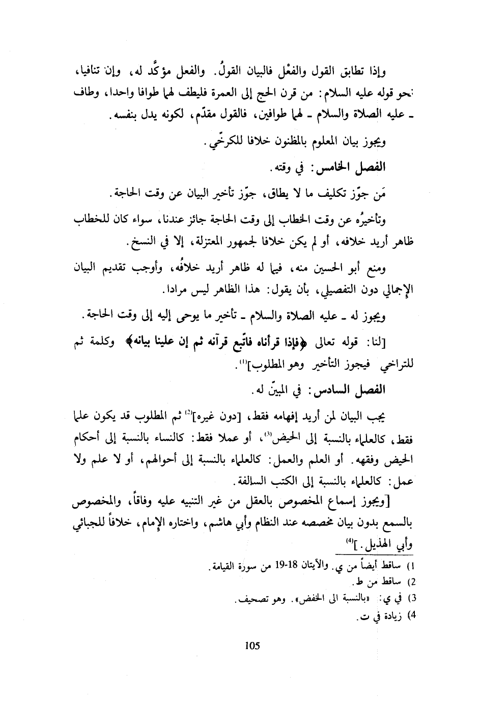 مَنْ جَوَّزَ تَكْلِيفَ مَا لَا يُطَاقُ جَوَّزَ تَأْخِيرَ الْبَيَانِ عَنْ وَقْتِ الْحَاجَةِ وَتَأْخِيرُهُ عَنْ وَقْتِ الْخِطَابِ إِلَى وَقْتِ الْحَاجَةِ جَائِزٌ عِنْدَنَا سَوَاءٌ كَانَ لِلْخِطَابِ ظَاهِرٌ أُرِيدَ خِلَافُهُ أَوْ لَمْ يَكُنْ خِلَافًا لِجُمْهُورِ الْمُعْتَزِلَةِ إِلَّا فِي النَّسْخِ وَمَنَعَ أَبُو الْحُسَيْنِ مِنْهُ فِيمَا لَهُ ظَاهِرٌ أُرِيدَ خِلَافُهُ وَأَوْجَبَ تَقْدِيمَ الْبَيَانِ الْإِجْمَالِيِّ دُونَ التَّفْصِيلِيِّ بِأَنْ يَقُولَ هَذَا الظَّاهِرُ لَيْسَ مُرَادًا وَيَجُوزُ لَهُ عَلَيْهِ الصَّلَاة وَالسَّلَام تَأْخِيرُ مَا يُوحَى إِلَيْهِ إِلَى وَقْتِ الْحَاجَةِ لَنَا قَوْله تَعَالَى {فَإِذَا قَرَأْنَاهُ فَاتَّبِعْ قُرْآنَهُ ثمَّ إِن علينا بَيَانه} وَكلمَة ثمَّ للتراخي فَيجوز التَّأْخِير وَهُوَ الْمَطْلُوب