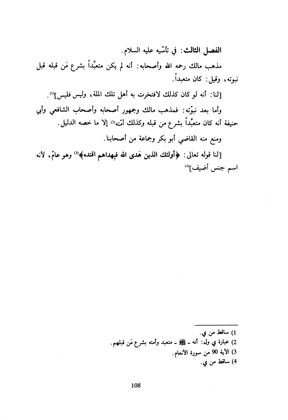 مَذْهَبُ مَالِكٍ رَحِمَهُ اللَّهُ وَأَصْحَابِهِ أَنَّهُ لَمْ يَكُنْ مُتَعَبِّدًا بِشَرْعِ مَنْ قَبْلَهُ قَبْلَ نُبُوَّتِهِ وَقِيلَ كَانَ مُتَعَبِّدًا لَنَا أَنَّهُ لَوْ كَانَ كَذَلِكَ لَافْتَخَرَتْ بِهِ أَهْلُ تِلْكَ الْمِلَّةِ وَلَيْسَ فَلَيْسَ وَأَمَّا بَعْدَ نُبُوَّتِهِ فَمَذْهَبُ مَالِكٍ وَجُمْهُورِ أَصْحَابه وَأَصْحَاب الشَّافِعِي وَأبي حنيفَة أَنَّهُ كَانَ مُتَعَبِّدًا بِشَرْعِ مَنْ قَبْلَهُ وَكَذَلِكَ أُمَّتُهُ إِلَّا مَا خَصَّهُ الدَّلِيلُ وَمَنَعَ مِنْهُ الْقَاضِي أَبُو بَكْرٍ وَجَمَاعَةٌ مِنْ أَصْحَابِنَا لَنَا قَوْله تَعَالَى {أُولَئِكَ الَّذِينَ هَدَى اللَّهُ فَبِهُدَاهُمُ اقتده} وَهُوَ عَامٌّ لِأَنَّهُ اسْمُ جِنْسٍ أُضِيفَ