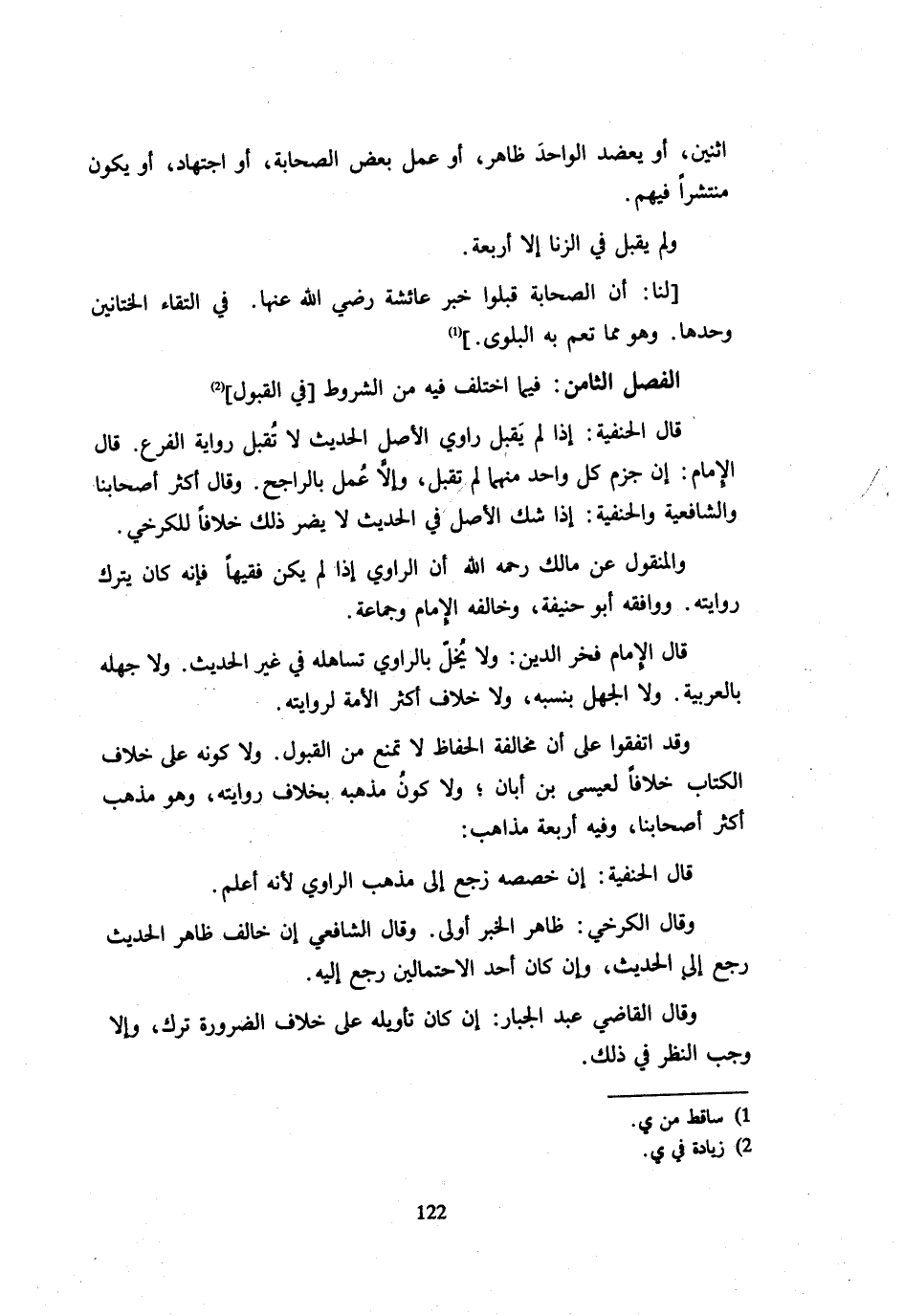 الْفَصْلُ الثَّامِنُ فِيمَا اخْتلف فِيهِ من الشُّرُوط فِي الْقَبُولِ