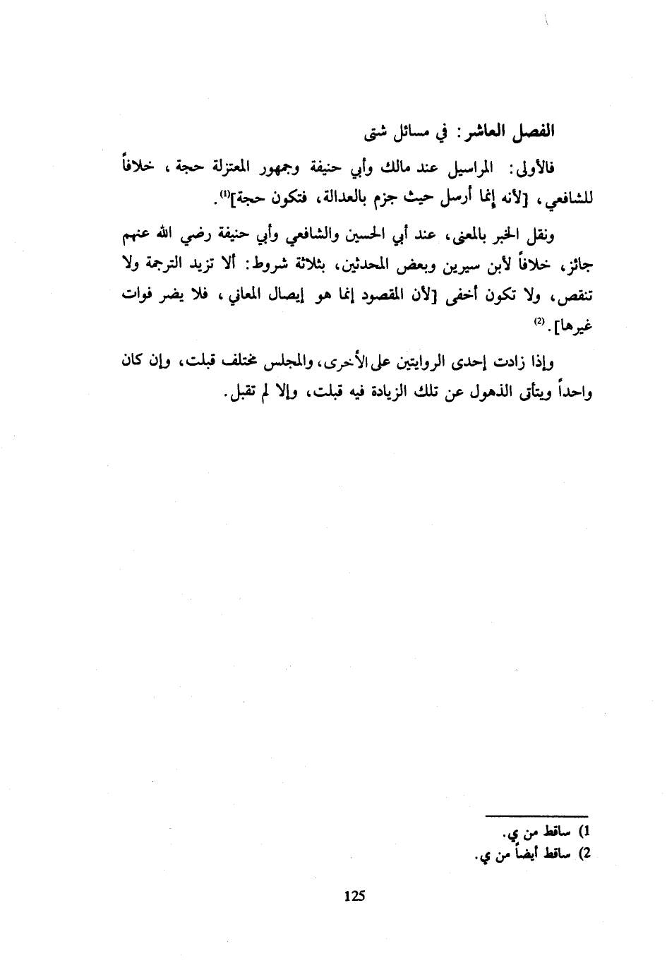فَالْأُولَى الْمَرَاسِيلُ عِنْد مَالك وَأبي حنيفَة وَجُمْهُور الْمُعْتَزلَة حجَّة خلافًا للشَّافِعِيّ لِأَنَّهُ إِنَّمَا أَرْسَلَ حَيْثُ جَزَمَ بِالْعَدَالَةِ فَتَكُونُ حُجَّةً. وَنَقْلُ الْخَبَرِ بِالْمَعْنَى عِنْدَ أَبِي الْحُسَيْنِ وَالشَّافِعِيّ وَأبي حنيفَة رَضِيَ اللَّهُ عَنْهُمْ جَائِزٌ خِلَافًا لِابْنِ سِيرِينَ وَبَعْضِ الْمُحَدِّثِينَ بِثَلَاثَةِ شُرُوطٍ أَلَّا تَزِيدَ التَّرْجَمَةُ وَلَا تَنْقُصَ وَلَا تَكُونَ أَخْفَى لِأَنَّ الْمَقْصُودَ إِنَّمَا هُوَ إِيصَالُ الْمَعَانِي فَلَا يَضُرُّ فَوَاتُ غَيْرِهَا وَإِذَا زَادَتْ إِحْدَى الرِّوَايَتَيْنِ عَلَى الْأُخْرَى وَالْمَجْلِسُ مُخْتَلِفٌ قُبِلَتْ وَإِنْ كَانَ وَاحِدًا وَيَتَأَتَّى الذُّهُولُ عَنْ تِلْكَ الزِّيَادَةِ فِيهِ قُبِلَتْ وَإِلَّا لم تقبل