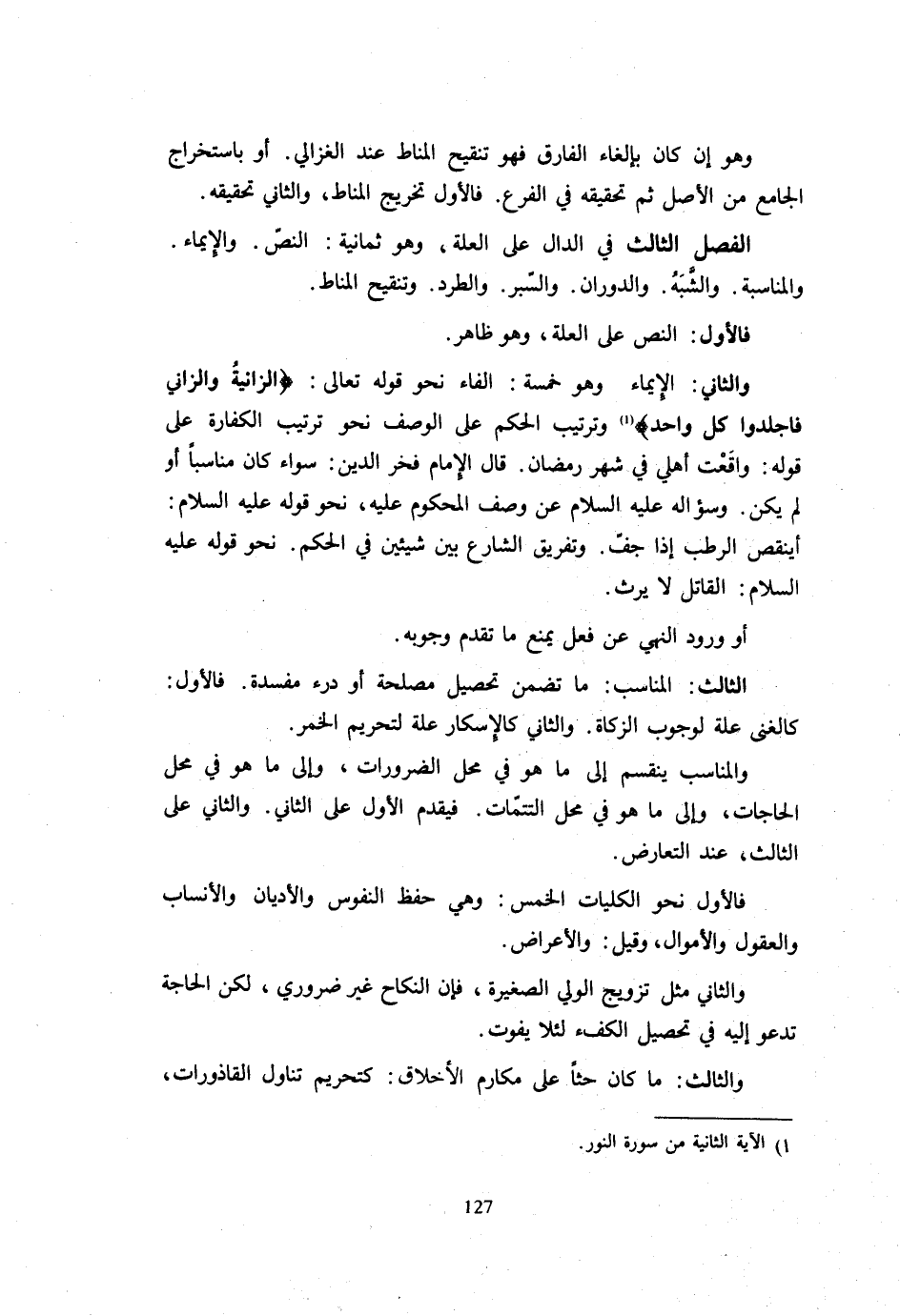وَهُوَ ثَمَانِيَةٌ النَّصُّ وَالْإِيمَاءُ وَالْمُنَاسَبَةُ وَالشَّبَهُ وَالدَّوَرَانُ والسبر والطرد وتنقيح المناط فَالْأول النَّص على الْعلَّة وَهُوَ ظَاهر وَالثَّانِي الْإِيمَاء وَهُوَ خَمْسَةٌ الْفَاءُ نَحْوَ قَوْله تَعَالَى {الزَّانِيَةُ وَالزَّانِي فَاجْلِدُوا كُلَّ وَاحِدٍ} وَتَرْتِيبُ الْحُكْمِ عَلَى الْوَصْفِ نَحْوَ تَرْتِيبِ الْكَفَّارَةِ عَلَى قَوْلِهِ وَاقَعْتُ أَهْلِي فِي شَهْرِ رَمَضَانَ قَالَ الإِمَام فَخر الدّين سَوَاءٌ كَانَ مُنَاسِبًا أَوْ لَمْ يَكُنْ وَسُؤَالُهُ عَلَيْهِ السَّلَامُ عَنْ وَصْفِ الْمَحْكُومِ عَلَيْهِ نَحْوَ قَوْلِهِ عَلَيْهِ السَّلَامُ أَيَنْقُصُ الرُّطَبُ إِذَا جَفَّ وَتَفْرِيقُ الشَّارِعِ بَيْنَ شَيْئَيْنِ فِي الْحُكْمِ نَحْوَ قَوْلِهِ عَلَيْهِ السَّلَامُ الْقَاتِلُ لَا يَرِثُ أَوْ وُرُودُ النَّهْيِ عَنْ فِعْلٍ يَمْنَعُ مَا تَقَدَّمَ وُجُوبه الثَّالِث الْمُنَاسب مَا تَضَمَّنَ تَحْصِيلَ مَصْلَحَةٍ أَوْ دَرْءَ مَفْسَدَةٍ فَالْأَوَّلُ كَالْغِنَى عِلَّةً لِوُجُوبِ الزَّكَاةِ وَالثَّانِي كَالْإِسْكَارِ عِلَّةً لِتَحْرِيمِ الْخَمْرِ وَالْمُنَاسِبُ يَنْقَسِمُ إِلَى مَا هُوَ فِي مَحَلِّ الضَّرُورَاتِ وَإِلَى مَا هُوَ فِي مَحَلِّ الْحَاجَاتِ وَإِلَى مَا هُوَ فِي مَحَلِّ التَّتِمَّاتِ فَيُقَدَّمُ الْأَوَّلُ عَلَى الثَّانِي وَالثَّانِي عَلَى الثَّالِثِ عِنْدَ التَّعَارُضِ فَالْأَوَّلُ نَحْوَ الْكُلِّيَّاتِ الْخَمْسِ وَهِيَ حِفْظُ النُّفُوسِ وَالْأَدْيَانِ وَالْأَنْسَابِ وَالْعُقُولِ وَالْأَمْوَالِ وَقِيلَ وَالْأَعْرَاضِ وَالثَّانِي مِثْلَ تَزْوِيجِ الْوَلِيِّ الصَّغِيرَةَ فَإِنَّ النِّكَاحَ غَيْرُ ضَرُورِيٍّ لَكِنَّ الْحَاجَةَ تَدْعُو إِلَيْهِ فِي تَحْصِيلِ الْكُفْءِ لِئَلَّا يَفُوتَ وَالثَّالِثُ مَا كَانَ حَثًّا عَلَى مَكَارِمِ الْأَخْلَاقِ كَتَحْرِيمِ تَنَاوُلِ الْقَاذُورَاتِ