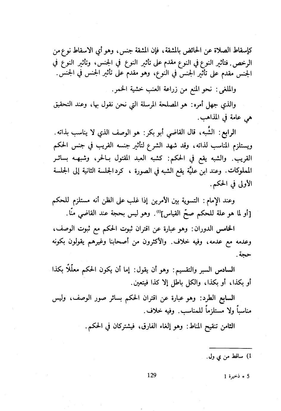 كَإِسْقَاطِ الصَّلَاةِ عَنِ الْحَائِضِ بِالْمَشَقَّةِ فَإِنَّ الْمَشَقَّةَ جِنْسٌ وَهُوَ أَيِ الْإِسْقَاطُ نَوْعٌ مِنَ الرُّخَصِ فتأثير النَّوْع فِي مُقَدَّمٌ عَلَى تَأْثِيرِ النَّوْعِ فِي الْجِنْسِ وَتَأْثِيرُ النَّوْعِ فِي الْجِنْسِ مُقَدَّمٌ عَلَى تَأْثِيرِ الْجِنْسِ فِي النَّوْعِ وَهُوَ مُقَدَّمٌ عَلَى تَأْثِيرِ الْجِنْسِ فِي الْجِنْسِ وَالْمُلْغَى نَحْوَ الْمَنْعِ مِنْ زِرَاعَةِ الْعِنَبِ خَشْيَةَ الْخَمْرِ وَالَّذِي جُهِلَ أَمْرُهُ هُوَ الْمَصْلَحَةُ الْمُرْسَلَةُ الَّتِي نَحْنُ نَقُولُ بِهَا وَعِنْدَ التَّحْقِيقِ هِيَ عَامَّةٌ فِي الْمَذَاهِبِ الرَّابِعُ الشَّبَهُ قَالَ الْقَاضِي أَبُو بَكْرٍ هُوَ الْوَصْفُ الَّذِي لَا يُنَاسِبُ بِذَاتِهِ وَيَسْتَلْزِمُ الْمُنَاسِبَ لِذَاتِهِ وَقَدْ شَهِدَ الشَّرْعُ لِتَأْثِيرِ جِنْسِهِ الْقَرِيبِ فِي جِنْسِ الْحُكْمِ الْقَرِيبِ وَالشَّبَهُ يَقَعُ فِي الْحُكْمِ كَشَبَهِ الْعَبْدِ الْمَقْتُولِ بِالْحُرِّ وَشَبَهِهِ بِسَائِرِ الْمَمْلُوكَاتِ وَعِنْدَ ابْنِ عُلَيَّةَ يَقَعُ الشَّبَهُ فِي الصُّورَةِ كَرَدِّ الْجِلْسَةِ الثَّانِيَةِ إِلَى الْجِلْسَةِ الْأُولَى فِي الْحُكْمِ وَعِنْدَ الْإِمَامِ التَّسْوِيَةُ بَيْنَ الْأَمْرَيْنِ إِذَا غَلَبَ عَلَى الظَّنِّ أَنَّهُ مُسْتَلْزِمٌ لِلْحُكْمِ أَوْ لِمَا هُوَ عِلَّةٌ لِلْحُكْمِ صَحَّ الْقِيَاسُ وَهُوَ لَيْسَ بِحُجَّةٍ عِنْدَ الْقَاضِي مِنَّا الْخَامِسُ الدَّوَرَانُ وَهُوَ عِبَارَةٌ عَنِ اقْتِرَانِ ثُبُوتِ الْحُكْمِ مَعَ ثُبُوتِ الْوَصْفِ وَعَدَمِهِ مَعَ عَدَمِهِ وَفِيهِ خِلَافٌ وَالْأَكْثَرُونَ مِنْ أَصْحَابِنَا وَغَيْرِهِمْ يَقُولُونَ بِكَوْنِهِ حُجَّةً السَّادِسُ الْبر وَالتَّقْسِيمُ وَهُوَ أَنْ يَقُولَ إِمَّا أَنْ يَكُونَ الْحُكْمُ مُعَلَّلًا بِكَذَا أَوْ بِكَذَا أَوْ بِكَذَا وَالْكُلُّ بَاطِلٌ إِلَّا كَذَا فَيَتَعَيَّنُ السَّابِعُ الطَّرْدُ وَهُوَ عِبَارَةٌ عَنِ اقْتِرَانِ الْحُكْمِ بِسَائِرِ صُوَرِ الْوَصْفِ وَلَيْسَ مُنَاسِبًا وَلَا مُسْتَلْزِمًا لِلْمُنَاسِبِ وَفِيهِ خِلَافٌ الثَّامِنُ تَنْقِيحُ الْمَنَاطِ وَهُوَ إِلْغَاءُ الْفَارِقِ فَيَشْتَرِكَانِ فِي الْحُكْمِ