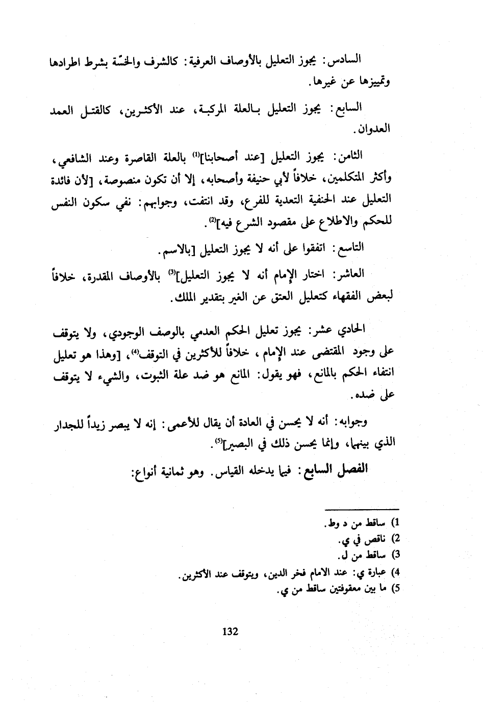 السَّادِسُ يَجُوزُ التَّعْلِيلُ بِالْأَوْصَافِ الْعُرْفِيَّةِ كَالشَّرَفِ وَالْخِسَّةِ بِشَرْطِ اطِّرَادِهَا وَتَمْيِيزِهَا عَنْ غَيْرِهَا السَّابِعُ يَجُوزُ التَّعْلِيلُ بِالْعِلَّةِ الْمُرَكَّبَةِ عِنْدَ الْأَكْثَرِينَ كَالْقَتْلِ الْعَمْدِ الْعُدْوَانِ الثَّامِنُ يَجُوزُ التَّعْلِيلُ عِنْدَ أَصْحَابِنَا بِالْعِلَّةِ القاصرة وَعند الشَّافِعِي وَأكْثر الْمُتَكَلِّمين خلافًا لأبي حنيفَة وَأَصْحَابِهِ إِلَّا أَنْ تَكُونَ مَنْصُوصَةً لِأَنَّ فَائِدَةَ التَّعْلِيلِ عِنْدَ الْحَنَفِيَّةِ التَّعْدِيَةُ لِلْفَرْعِ وَقَدِ انْتَفَتْ وَجَوَابُهُمْ نَفْيُ سُكُونِ النَّفْسِ لِلْحُكْمِ وَالِاطِّلَاعُ عَلَى مَقْصُودِ الشَّرْعِ فِيهِ التَّاسِعُ اتَّفَقُوا عَلَى أَنَّهُ لَا يَجُوزُ التَّعْلِيلُ بِالِاسْمِ الْعَاشِرُ اخْتَارَ الْإِمَامُ أَنه لايجوز التَّعْلِيلُ بِالْأَوْصَافِ الْمُقَدَّرَةِ خِلَافًا لِبَعْضِ الْفُقَهَاءِ كَتَعْلِيلِ الْعِتْقِ عَنِ الْغَيْرِ بِتَقْدِيرِ الْمِلْكِ الْحَادِيَ عَشَرَ يَجُوزُ تَعْلِيلُ الْحُكْمِ الْعَدَمِيِّ بِالْوَصْفِ الْوُجُودِيِّ وَلَا يَتَوَقَّفُ عَلَى وُجُودِ الْمُقْتَضَى عِنْدَ الْإِمَامِ خِلَافًا لِلْأَكْثَرِينَ فِي التَّوَقُّفِ وَهَذَا هُوَ تَعْلِيلُ انْتِفَاءِ الْحُكْمِ بِالْمَانِعِ فَهُوَ يَقُولُ الْمَانِعُ هُوَ ضِدُّ عِلَّةِ الثُّبُوتِ وَالشَّيْءُ لَا يَتَوَقَّفُ عَلَى ضِدِّهِ وَجَوَابُهُ أَنَّهُ لَا يَحْسُنُ فِي الْعَادَةِ أَنْ يُقَالَ لِلْأَعْمَى إِنَّهُ لَا يُبْصِرُ زَيْدًا لِلْجِدَارِ الَّذِي بَيْنَهُمَا وَإِنَّمَا يَحْسُنُ ذَلِكَ فِي الْبَصِيرِ