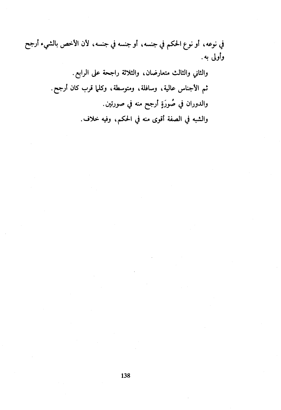 فِي نَوعه أَو نوع الحكم فِي جِنْسِهِ أَوْ جِنْسِهِ فِي جِنْسِهِ لِأَنَّ الْأَخَصَّ بِالشَّيْءِ أَرْجَحُ وَأَوْلَى بِهِ وَالثَّانِي وَالثَّالِثُ مُتَعَارِضَانِ وَالثَّلَاثَةُ رَاجِحَةٌ عَلَى الرَّابِعِ ثُمَّ الْأَجْنَاسُ عَالِيَةٌ وَسَافِلَةٌ وَمُتَوَسِّطَةٌ وَكُلَّمَا قَرُبَ كَانَ أَرْجَحَ وَالدَّوَرَانُ فِي صُورَةٍ أَرْجَحُ مِنْهُ فِي صُورَتَيْنِ وَالشَّبَهُ فِي الصِّفَةِ أَقْوَى مِنْهُ فِي الْحُكْمِ وَفِيه خلاف