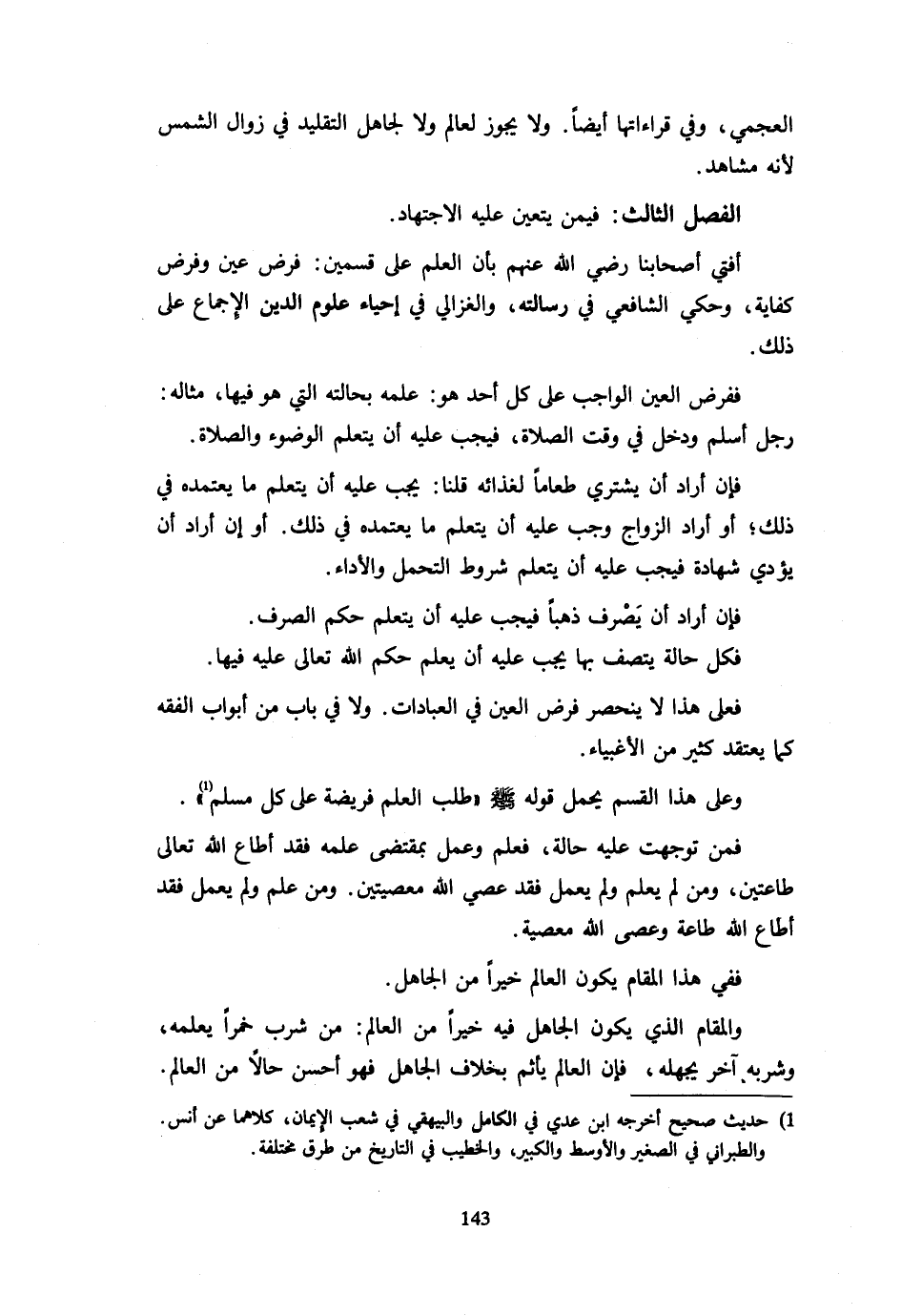 أَفْتَى أَصْحَابُنَا رَضِيَ اللَّهُ عَنْهُمْ بِأَنَّ الْعِلْمَ عَلَى قِسْمَيْنِ فَرْضُ عَيْنٍ وَفَرْضُ كِفَايَةٍ وَحَكَى الشَّافِعِي فِي رِسَالَتِهِ وَالْغَزَّالِيُّ فِي إِحْيَاءِ عُلُومِ الدِّينِ الْإِجْمَاعَ عَلَى ذَلِكَ فَفَرْضُ الْعَيْنِ الْوَاجِبِ عَلَى كُلِّ أَحَدٍ هُوَ عِلْمُهُ بِحَالَتِهِ الَّتِي هُوَ فِيهَا مِثَالُهُ رَجُلٌ أَسْلَمَ وَدَخَلَ فِي وَقْتِ الصَّلَاةِ فَيَجِبُ عَلَيْهِ أَنْ يَتَعَلَّمَ الْوُضُوءَ وَالصَّلَاةَ فَإِنْ أَرَادَ أَنْ يَشْتَرِيَ طَعَامًا لِغِذَائِهِ قُلْنَا يَجِبُ عَلَيْهِ أَنْ يَتَعَلَّمَ مَا يَعْتَمِدُهُ فِي ذَلِكَ أَوْ أَرَادَ الزَّوَاجَ وَجَبَ عَلَيْهِ أَنْ يَتَعَلَّمَ مَا يَعْتَمِدُهُ فِي ذَلِكَ أَوْ إِنْ أَرَادَ أَنْ يُؤَدِّيَ شَهَادَةً فَيَجِبُ عَلَيْهِ أَنْ يَتَعَلَّمَ شُرُوطَ التَّحَمُّلِ وَالْأَدَاءِ فَإِنْ أَرَادَ أَنْ يَصْرِفَ ذَهَبًا فَيَجِبُ عَلَيْهِ أَنْ يَتَعَلَّمَ حُكْمَ الصَّرْفِ فَكُلُّ حَالَةٍ يَتَّصِفُ بِهَا يَجِبُ عَلَيْهِ أَنْ يَعْلَمَ حُكْمَ اللَّهِ تَعَالَى عَلَيْهِ فِيهَا فَعَلَى هَذَا لَا يَنْحَصِرُ فَرْضُ الْعَيْنِ فِي الْعِبَادَاتِ وَلَا فِي بَابٍ مِنْ أَبْوَابِ الْفِقْهِ كَمَا يَعْتَقِدُ كَثِيرٌ مِنَ الْأَغْبِيَاءِ وَعَلَى هَذَا الْقِسْمِ يُحْمَلُ قَوْلُهُ صَلَّى اللَّهُ عَلَيْهِ وَسَلَّمَ