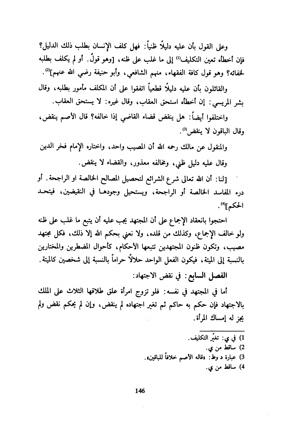 وَعَلَى الْقَوْلِ بِأَنَّ عَلَيْهِ دَلِيلًا ظَنِّيًّا فَهَلْ كُلِّفَ الْإِنْسَانُ بِطَلَبِ ذَلِكَ الدَّلِيلِ فَإِنْ أَخْطَأَهُ تَعَيَّنَ التَّكْلِيفُ إِلَى مَا غَلَبَ عَلَى ظَنِّهِ وَهُوَ قَوْلٌ أَوْ لَمْ يُكَلَّفْ بِطَلَبِهِ لِخَفَائِهِ وَهُوَ قَول كَافَّة الْفُقَهَاء مِنْهُم الشَّافِعِي وَأَبُو حنيفَة رَضِيَ اللَّهُ عَنْهُمْ وَالْقَائِلُونَ بِأَنَّ عَلَيْهِ دَلِيلًا قَطْعِيًّا اتَّفَقُوا عَلَى أَنَّ الْمُكَلَّفَ مَأْمُورٌ بِطَلَبِهِ وَقَالَ بِشْرٌ الْمَرِيسِيُّ إِنَّ أَخْطَأَهُ اسْتَحَقَّ الْعِقَابَ وَقَالَ غَيْرُهُ لَا يَسْتَحِقُّ الْعِقَابَ وَاخْتَلَفُوا أَيْضًا هَلْ يُنْقَضُ قَضَاءُ الْقَاضِي إِذَا خَالَفَهُ قَالَ الْأَصَمُّ يُنْقَضُ وَقَالَ الْبَاقُونَ لَا يُنْقَضُ وَالْمَنْقُولُ عَنْ مَالِكٍ رَحِمَهُ اللَّهُ أَنَّ الْمُصِيبَ وَاحِدٌ وَاخْتَارَهُ الْإِمَامُ فَخْرُ الدِّينِ وَقَالَ عَلَيْهِ دَلِيلٌ ظَنِّيٌّ وَمُخَالِفُهُ مَعْذُورٌ وَالْقَضَاءُ لَا يُنْقَضُ لَنَا أَنَّ اللَّهَ تَعَالَى شَرَعَ الشَّرَائِعَ لِتَحْصِيلِ الْمَصَالِحِ الْخَالِصَةِ أَوِ الرَّاجِحَةِ أَوْ دَرْءِ الْمَفَاسِدِ الْخَالِصَةِ أَوِ الرَّاجِحَةِ وَيَسْتَحِيلُ وُجُودُهَا فِي النَّقِيضَيْنِ فَيَتَّحِدُ الْحُكْمُ احْتَجُّوا بِانْعِقَادِ الْإِجْمَاعِ عَلَى أَنَّ الْمُجْتَهِدَ يَجِبُ عَلَيْهِ أَنْ يَتَّبِعَ مَا غَلَبَ عَلَى ظَنِّهِ وَلَوْ خَالَفَ الْإِجْمَاعَ وَكَذَلِكَ مَنْ قَلَّدَهُ وَلَا نَعْنِي بِحُكْمِ اللَّهِ إِلَّا ذَلِكَ فَكُلُّ مُجْتَهِدٍ مُصِيبٌ وَتَكُونُ ظُنُونُ الْمُجْتَهِدِينَ تَتْبَعُهَا الْأَحْكَامُ كَأَحْوَالِ الْمُضْطَرِّينَ وَالْمُخْتَارِينَ بِالنِّسْبَةِ إِلَى الْمَيْتَةِ فَيَكُونُ الْفِعْلُ الْوَاحِدُ حَلَالًا حَرَامًا بِالنِّسْبَةِ إِلَى شَخْصَيْنِ كالميتة