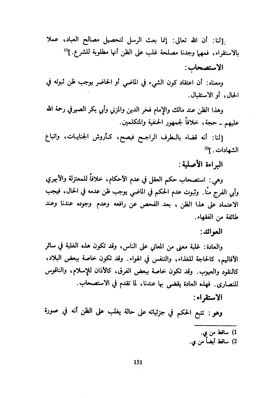 وَمَعْنَاهُ أَنَّ اعْتِقَادَ كَوْنِ الشَّيْءِ فِي الْمَاضِي أَوِ الْحَاضِرِ يُوجِبُ ظَنَّ ثُبُوتِهِ فِي الْحَالِ أَوِ الِاسْتِقْبَالِ وَهَذَا الظَّنُّ عِنْدَ مَالِكٍ وَالْإِمَامِ فَخْرِ الدِّينِ وَالْمُزَنِيِّ وَأَبِي بَكْرٍ الصَّيْرَفِيِّ رَحْمَةُ اللَّهِ عَلَيْهِمْ حُجَّةٌ خِلَافًا لِجُمْهُورِ الْحَنَفِيَّةِ وَالْمُتَكَلِّمِينَ لَنَا أَنَّهُ قَضَاءٌ بِالطَّرَفِ الرَّاجِحِ فَيَصِحُّ كَأُرُوشِ الْجِنَايَاتِ وَاتِّبَاعِ الشَّهَادَاتِ