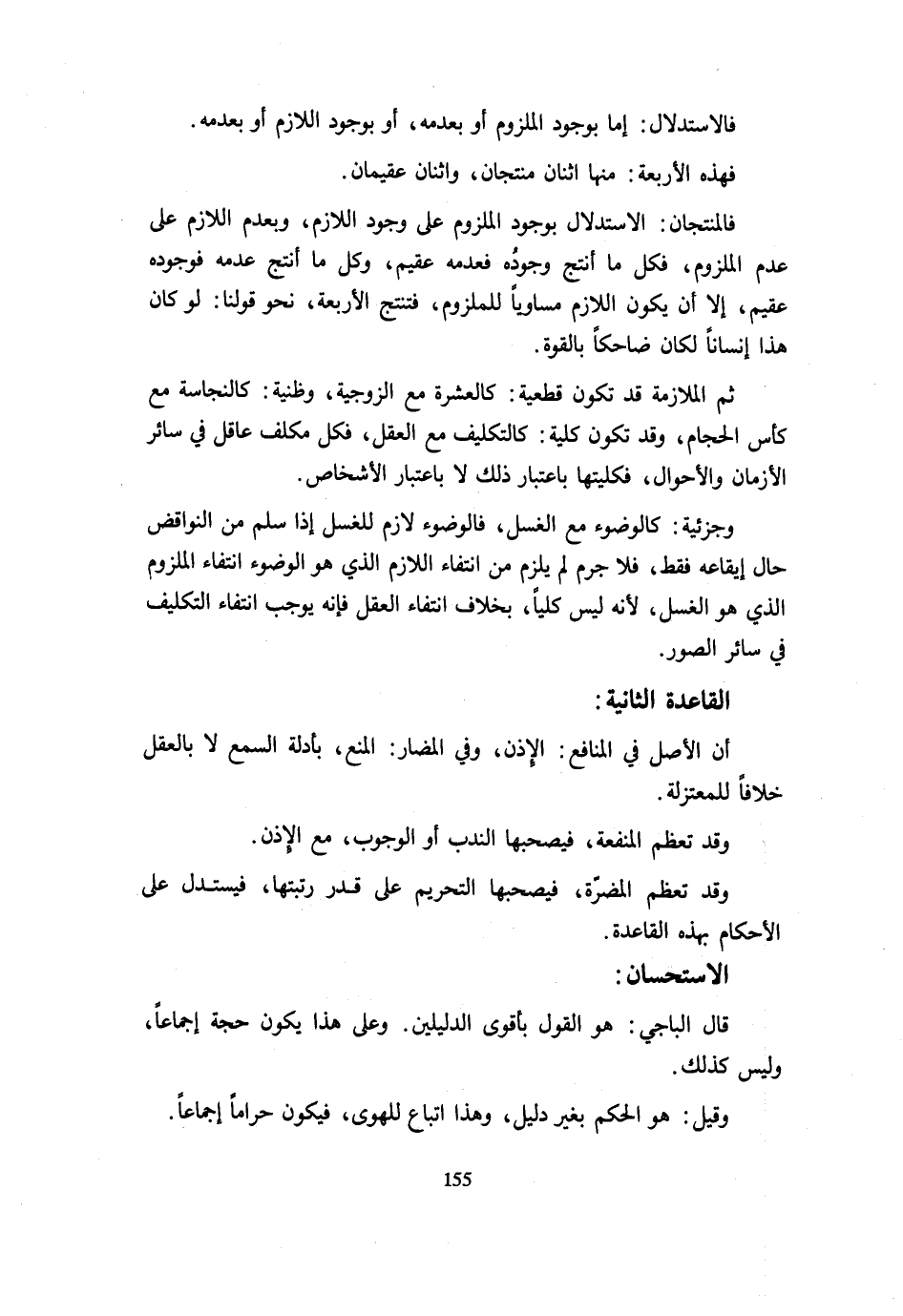 فَالِاسْتِدْلَالُ إِمَّا بِوُجُودِ الْمَلْزُومِ أَوْ بِعَدَمِهِ أَوْ بِوُجُودِ اللَّازِمِ أَوْ بِعَدَمِهِ فَهَذِهِ الْأَرْبَعَةُ مِنْهَا اثْنَانِ مُنْتِجَانِ وَاثْنَانِ عَقِيمَانِ فَالْمُنْتِجَانِ الِاسْتِدْلَالُ بِوُجُودِ الْمَلْزُومِ عَلَى وُجُودِ اللَّازِمِ وَبِعَدَمِ اللَّازِمِ عَلَى عَدَمِ الْمَلْزُومِ فَكُلُّ مَا أَنْتَجَ وُجُودُهُ فَعَدَمُهُ عَقِيمٌ وَكُلُّ مَا أَنْتَجَ عَدَمُهُ فَوُجُودُهُ عَقِيمٌ إِلَّا أَنْ يَكُونَ اللَّازِمُ مُسَاوِيًا لِلْمَلْزُومِ فَتُنْتِجُ الْأَرْبَعَةُ نَحْوَ قَوْلِنَا لَوْ كَانَ هَذَا إِنْسَانًا لَكَانَ ضَاحِكًا بِالْقُوَّةِ ثُمَّ الْمُلَازَمَةُ قَدْ تَكُونُ قَطْعِيَّةً كَالْعِشْرَةِ مَعَ الزَّوْجِيَّةِ وَظَنِّيَّةً كَالنَّجَاسَةِ مَعَ كَأْسِ الْحَجَّامِ وَقَدْ تَكُونُ كُلِّيَّةً كَالتَّكْلِيفِ مَعَ الْعَقْلِ فَكُلُّ مُكَلَّفٍ عَاقِلٌ فِي سَائِرِ الْأَزْمَانِ وَالْأَحْوَالِ فَكُلِّيَّتُهَا بِاعْتِبَارِ ذَلِكَ لَا بِاعْتِبَارِ الْأَشْخَاصِ وَجُزْئِيَّةً كَالْوُضُوءِ مَعَ الْغُسْلِ فَالْوُضُوءُ لَازِمٌ لِلْغُسْلِ إِذَا سَلِمَ مِنَ النَّوَاقِضِ حَالَ إِيقَاعِهِ فَقَطْ فَلَا جَرَمَ لَمْ يَلْزَمْ مِنِ انْتِفَاءِ اللَّازِمِ الَّذِي هُوَ الْوُضُوءُ انْتِفَاءُ الْمَلْزُومِ الَّذِي هُوَ الْغُسْلُ لِأَنَّه لَيْسَ كُلِّيًّا بِخِلَافِ انْتِفَاءِ الْعَقْلِ فَإِنَّهُ يُوجِبُ انْتِفَاءَ التَّكْلِيفِ فِي سَائِرِ الصُّوَرِ