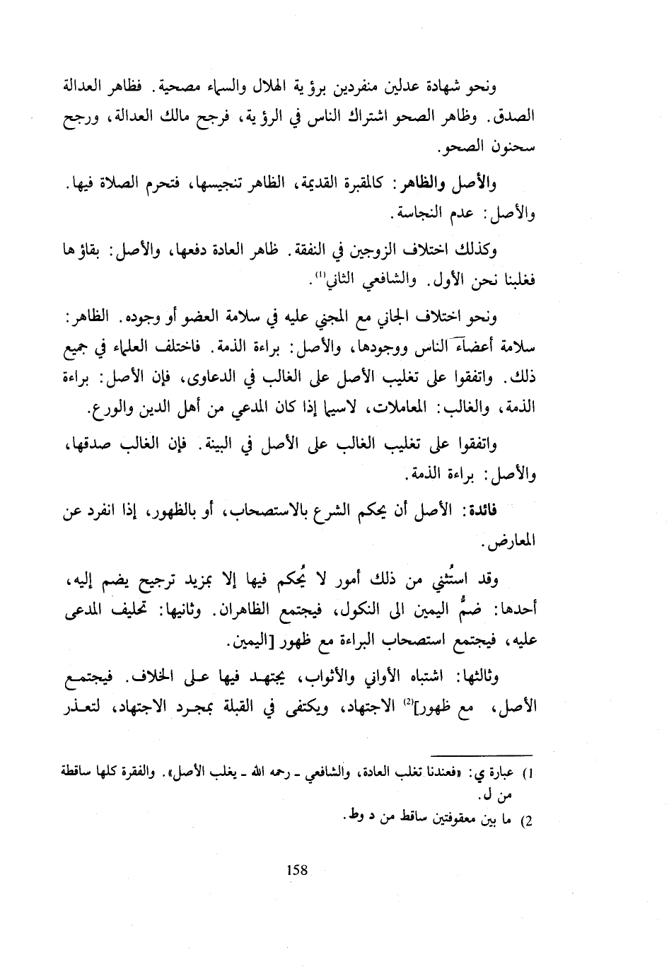 وَنَحْوَ شَهَادَةِ عَدْلَيْنِ مُنْفَرِدَيْنِ بِرُؤْيَةِ الْهِلَالِ وَالسَّمَاءِ مُصْحِيَةٌ فَظَاهِرُ الْعَدَالَةِ الصِّدْقُ وَظَاهِرُ الصَّحْوِ اشْتِرَاكُ النَّاسِ فِي الرُّؤْيَةِ فَرَجَّحَ مَالِكٌ الْعَدَالَةَ وَرَجَّحَ سَحْنُونٌ الصَّحْوَ وَالْأَصْلُ وَالظَّاهِرُ كَالْمَقْبَرَةِ الْقَدِيمَةِ الظَّاهِرِ تَنْجِيسُهَا فَتَحْرُمُ الصَّلَاةُ فِيهَا وَالْأَصْلُ عَدَمُ النَّجَاسَةِ وَكَذَلِكَ اخْتِلَافُ الزَّوْجَيْنِ فِي النَّفَقَةِ ظَاهِرُ الْعَادَةِ دَفعهَا وَالْأَصْل بَقَاؤُهَا فغلبنا نَحن الأول وَالشَّافِعِيّ الثَّانِيَ وَنَحْوَ اخْتِلَافِ الْجَانِي مَعَ الْمَجْنِيِّ عَلَيْهِ فِي سَلَامَةِ الْعُضْوِ أَوْ وُجُودِهِ الظَّاهِرُ سَلَامَةُ أَعْضَاءِ النَّاسِ وَوُجُودُهَا وَالْأَصْلُ بَرَاءَةُ الذِّمَّةِ فَاخْتَلَفَ الْعُلَمَاءُ فِي جَمِيعِ ذَلِكَ وَاتَّفَقُوا عَلَى تَغْلِيبِ الْأَصْلِ عَلَى الْغَالِبِ فِي الدَّعَاوَى فَإِنَّ الْأَصْلَ بَرَاءَةُ الذِّمَّةِ وَالْغَالِبُ الْمُعَامَلَاتُ لَا سِيَّمَا إِذَا كَانَ الْمُدَّعِي مِنْ أَهْلِ الدِّينِ وَالْوَرَعِ وَاتَّفَقُوا عَلَى تَغْلِيبِ الْغَالِبِ عَلَى الْأَصْلِ فِي الْبَيِّنَةِ فَإِنَّ الْغَالِبَ صِدْقُهَا وَالْأَصْلُ بَرَاءَةُ الذِّمَّةِ فَائِدَةٌ الْأَصْلُ أَنْ يَحْكُمَ الشَّرْعُ بِالِاسْتِصْحَابِ أَوْ بِالظُّهُورِ إِذَا انْفَرَدَ عَنِ الْمُعَارِضِ وَقَدِ اسْتُثْنِيَ مِنْ ذَلِكَ أُمُورٌ لَا يُحْكَمُ فِيهَا إِلَّا بِمَزِيدِ تَرْجِيحٍ يُضَمُّ إِلَيْهِ أَحَدُهَا ضَمَّ الْيَمِينِ إِلَى النُّكُولِ فَيَجْتَمِعُ الظَّاهِرَانِ وَثَانِيهَا تَحْلِيفُ الْمُدَّعَى عَلَيْهِ فَيَجْتَمِعُ اسْتِصْحَابُ الْبَرَاءَةِ مَعَ ظُهُورِ الْيَمِينِ وَثَالِثُهَا اشْتِبَاهُ الْأَوَانِي وَالْأَثْوَابُ يُجْتَهَدُ فِيهَا عَلَى الْخِلَافِ فَيَجْتَمِعُ الْأَصْلُ مَعَ ظُهُورِ الِاجْتِهَادِ وَيُكْتَفَى فِي الْقِبْلَةِ بِمُجَرَّدِ الِاجْتِهَادِ لِتَعَذُّرِ