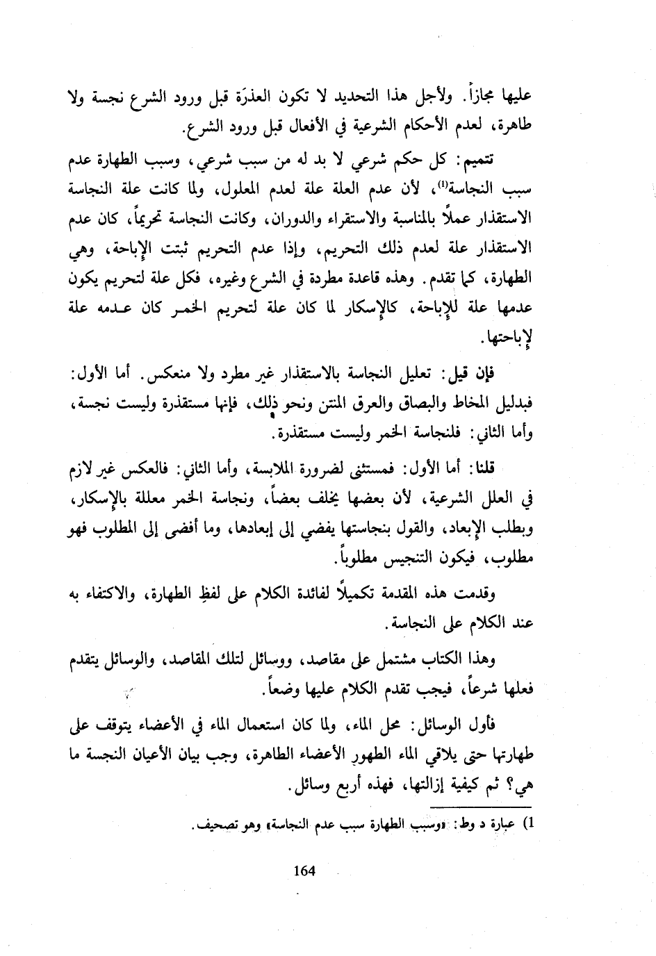 عَلَيْهَا مَجَازًا وَلِأَجْلِ هَذَا التَّحْدِيدِ لَا تَكُونُ الْعَذِرَةُ قَبْلَ وُرُودِ الشَّرْعِ نَجِسَةً وَلَا طَاهِرَةً لِعَدَمِ الْأَحْكَامِ الشَّرْعِيَّةِ فِي الْأَفْعَالِ قَبْلَ وُرُودِ الشَّرْعِ. تَتْمِيمٌ كُلُّ حُكْمٍ شَرْعِيٍّ لَا بُدَّ لَهُ مِنْ سَبَبٍ شَرْعِيٍّ وَسَبَبُ الطَّهَارَةِ عَدَمُ سَبَبِ النَّجَاسَةِ لِأَنَّ عَدَمَ الْعِلَّةِ عِلَّةٌ لِعَدَمِ الْمَعْلُولِ وَلَمَّا كَانَتْ عِلَّةُ النَّجَاسَةِ الِاسْتِقْذَارَ عَمَلًا بِالْمُنَاسَبَةِ وَالِاسْتِقْرَاءِ وَالدَّوَرَانِ وَكَانَتِ النَّجَاسَةُ تَحْرِيمًا كَانَ عَدَمُ الِاسْتِقْذَارِ عِلَّةً لِعَدَمِ ذَلِكَ التَّحْرِيمِ وَإِذَا عُدِمَ التَّحْرِيمُ ثَبَتَتِ الْإِبَاحَةُ وَهِيَ الطَّهَارَةُ كَمَا تَقَدَّمَ وَهَذِهِ قَاعِدَةٌ مُطَّرِدَةٌ فِي الشَّرْعِ وَغَيْرِهِ فَكُلُّ عِلَّةٍ لِتَحْرِيمٍ يَكُونُ عَدَمُهَا عِلَّةً لِلْإِبَاحَةِ كَالْإِسْكَارِ لَمَّا كَانَ عِلَّةً لِتَحْرِيمِ الْخَمْرِ كَانَ عَدَمُهُ عِلَّةً لِإِبَاحَتِهَا. فَإِنْ قِيلَ تَعْلِيلُ النَّجَاسَةِ بِالِاسْتِقْذَارِ غَيْرُ مُطَّرِدٍ وَلَا مُنْعَكِسٍ أَمَّا الْأَوَّلُ فَبِدَلِيلِ الْمُخَاطِ وَالْبُصَاقِ وَالْعَرَقِ الْمُنْتِنِ وَنَحْوِ ذَلِكَ فَإِنَّهَا مُسْتَقْذَرَةٌ وَلَيْسَتْ نَجِسَةً وَأَمَّا الثَّانِي فَلِنَجَاسَةِ الْخَمْرِ وَلَيْسَتْ مُسْتَقْذَرَةً. قُلْنَا أَمَّا الْأَوَّلُ فَمُسْتَثْنَى لِضَرُورَةِ الْمُلَابَسَةِ وَأَمَّا الثَّانِي فَالْعَكْسُ غَيْرُ لَازِمٍ فِي الْعِلَلِ الشَّرْعِيَّةِ لِأَنَّ بَعْضَهَا يَخْلُفُ بَعْضًا وَنَجَاسَةُ الْخَمْرِ مُعَلَّلَةٌ بِالْإِسْكَارِ وَبِطَلَبِ الْإِبْعَادِ وَالْقَوْلُ بِنَجَاسَتِهَا يُفْضِي إِلَى إِبْعَادِهَا وَمَا أَفْضَى إِلَى الْمَطْلُوبِ فَهُوَ مَطْلُوبٌ فَيَكُونُ التَّنْجِيسُ مَطْلُوبًا. وَقُدِّمَتْ هَذِهِ الْمُقَدِّمَةُ تَكْمِيلًا لِفَائِدَةِ الْكَلَامِ عَلَى لَفْظِ الطَّهَارَةِ وَالِاكْتِفَاءِ بِهِ عِنْدَ الْكَلَامِ عَلَى النَّجَاسَةِ. وَهَذَا الْكِتَابُ مُشْتَمِلٌ عَلَى مَقَاصِدَ وَوَسَائِلَ لِتِلْكَ الْمَقَاصِدِ وَالْوَسَائِلُ يَتَقَدَّمُ فِعْلُهَا شَرْعًا فَيَجِبُ تَقَدُّمُ الْكَلَامِ عَلَيْهَا وَضْعًا. فَأَوَّلُ الْوَسَائِلِ مَحَلُّ الْمَاءِ وَلَمَّا كَانَ اسْتِعْمَالُ الْمَاءِ فِي الْأَعْضَاءِ يَتَوَقَّفُ عَلَى طَهَارَتِهَا حَتَّى يُلَاقِيَ الْمَاءُ الطَّهُورُ الْأَعْضَاءَ الطَّاهِرَةَ وَجَبَ بَيَانُ الْأَعْيَانِ النَّجِسَةِ مَا هِيَ ثُمَّ كَيْفِيَّةُ إِزَالَتِهَا فَهَذِهِ أَرْبَعُ وَسَائِلَ.