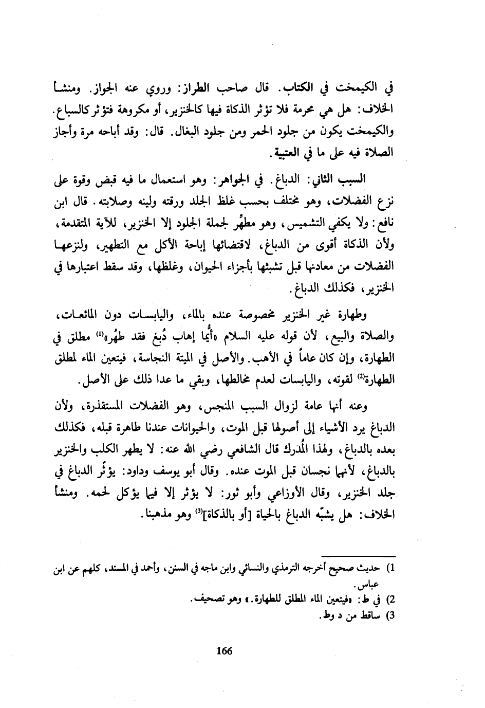 فِي الْكِيمُخْتِ فِي الْكِتَابِ قَالَ صَاحِبُ الطَّرَّازِ وَرُوِيَ عَنْهُ الْجَوَازُ وَمَنْشَأُ الْخِلَافِ هَلْ هِيَ مُحَرَّمَةٌ فَلَا تُؤَثِّرُ الذَّكَاةُ فِيهَا كَالْخِنْزِيرِ أَوْ مَكْرُوهَةٌ فَتُؤَثِّرُ كَالسِّبَاعِ وَالْكِيمُخْتُ يَكُونُ مِنْ جُلُودِ الْحُمُرِ وَمِنْ جُلُودِ الْبِغَالِ قَالَ وَقَدْ أَبَاحَهُ مَرَّةً وَأَجَازَ الصَّلَاةَ فِيهِ عَلَى مَا فِي الْعُتْبِيَّةِ. السَّبَبُ الثَّانِي الدِّبَاغُ فِي الْجَوَاهِرِ وَهُوَ اسْتِعْمَالُ مَا فِيهِ قَبْضٌ وَقُوَّةٌ عَلَى نَزْعِ الْفَضَلَاتِ وَهُوَ مُخْتَلِفٌ بِحَسَبِ غِلَظِ الْجِلْدِ وَرِقَّتِهِ وَلِينِهِ وَصَلَابَتِهِ قَالَ ابْنُ نَافِعٍ وَلَا يَكْفِي التشميس وَهُوَ مطهر لِجُمْلَةِ الْجُلُودِ إِلَّا الْخِنْزِيرَ لِلْآيَةِ الْمُتَقَدِّمَةِ وَلِأَنَّ الذَّكَاةَ أَقْوَى مِنَ الدِّبَاغِ لِاقْتِضَائِهَا إِبَاحَةَ الْأَكْلِ مَعَ التَّطْهِيرِ وَلِنَزْعِهَا الْفَضَلَاتِ مِنْ مَعَادِنِهَا قَبْلَ تَشَبُّثِهَا بِأَجْزَاءِ الْحَيَوَانِ وَغِلَظِهَا وَقَدْ سَقَطَ اعْتِبَارُهَا فِي الْخِنْزِيرِ فَكَذَلِكَ الدِّبَاغُ. وَطَهَارَةُ غَيْرِ الْخِنْزِيرِ مَخْصُوصَةٌ عِنْدَهُ بِالْمَاءِ وَالْيَابِسَاتِ دُونَ الْمَائِعَاتِ وَالصَّلَاةِ وَالْبَيْعِ لِأَنَّ قَوْلَهُ عَلَيْهِ السَّلَامُ أَيُّمَا إِهَابٍ دُبِغَ فَقَدْ طَهُرَ مُطْلَقٌ فِي الطَّهَارَةِ وَإِنْ كَانَ عَامًّا فِي الْأُهُبِ وَالْأَصْلُ فِي الْمَيْتَةِ النَّجَاسَةُ فَيَتَعَيَّنُ الْمَاءُ لِمُطْلَقِ الطَّهَارَةِ لِقُوَّتِهِ وَالْيَابِسَاتُ لِعَدَمِ مُخَالِطِهَا وَبَقِيَ مَا عَدَا ذَلِكَ عَلَى الْأَصْلِ. وَعَنْهُ أَنَّهَا عَامَّةٌ لِزَوَالِ السَّبَبِ الْمُنَجِّسِ وَهُوَ الْفَضَلَاتُ الْمُسْتَقْذَرَةُ وَلِأَنَّ الدِّبَاغَ يَرُدُّ الْأَشْيَاءَ إِلَى أُصُولِهَا قَبْلَ الْمَوْتِ وَالْحَيَوَانَاتُ عِنْدَنَا طَاهِرَةٌ قَبْلَهُ فَكَذَلِكَ بَعْدَهُ بِالدِّبَاغِ وَلِهَذَا الْمَدْرَكِ قَالَ الشَّافِعِي رَضِيَ اللَّهُ عَنْهُ لَا يُطَهَّرُ الْكَلْبُ وَالْخِنْزِيرُ بِالدِّبَاغِ لِأَنَّهُمَا نَجِسَانِ قَبْلَ الْمَوْتِ عِنْدَهُ وَقَالَ أَبُو يُوسُفَ وَدَاوُدُ يُؤَثِّرُ الدِّبَاغُ فِي جِلْدِ الْخِنْزِيرِ وَقَالَ الْأَوْزَاعِيُّ وَأَبُو ثَوْرٍ لَا يُؤَثِّرُ إِلَّا فِيمَا يُؤْكَلُ لَحْمُهُ وَمَنْشَأُ الْخِلَافِ هَلْ يُشَبَّهُ الدِّبَاغُ بِالْحَيَاةِ أَوْ بِالذَّكَاةِ وَهُوَ مَذْهَبُنَا.