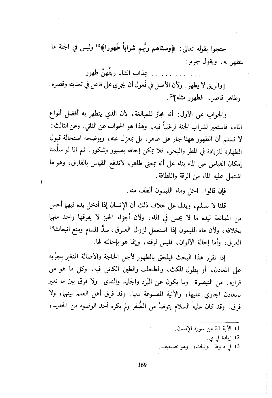 احْتَجُّوا بِقَوْلِهِ تَعَالَى {وَسَقَاهُمْ رَبُّهُمْ شَرَابًا طَهُورًا} وَلَيْسَ فِي الْجَنَّةِ مَا يُتَطَهَّرُ بِهِ وَبِقَوْلِ جرير: ... ... ... ...