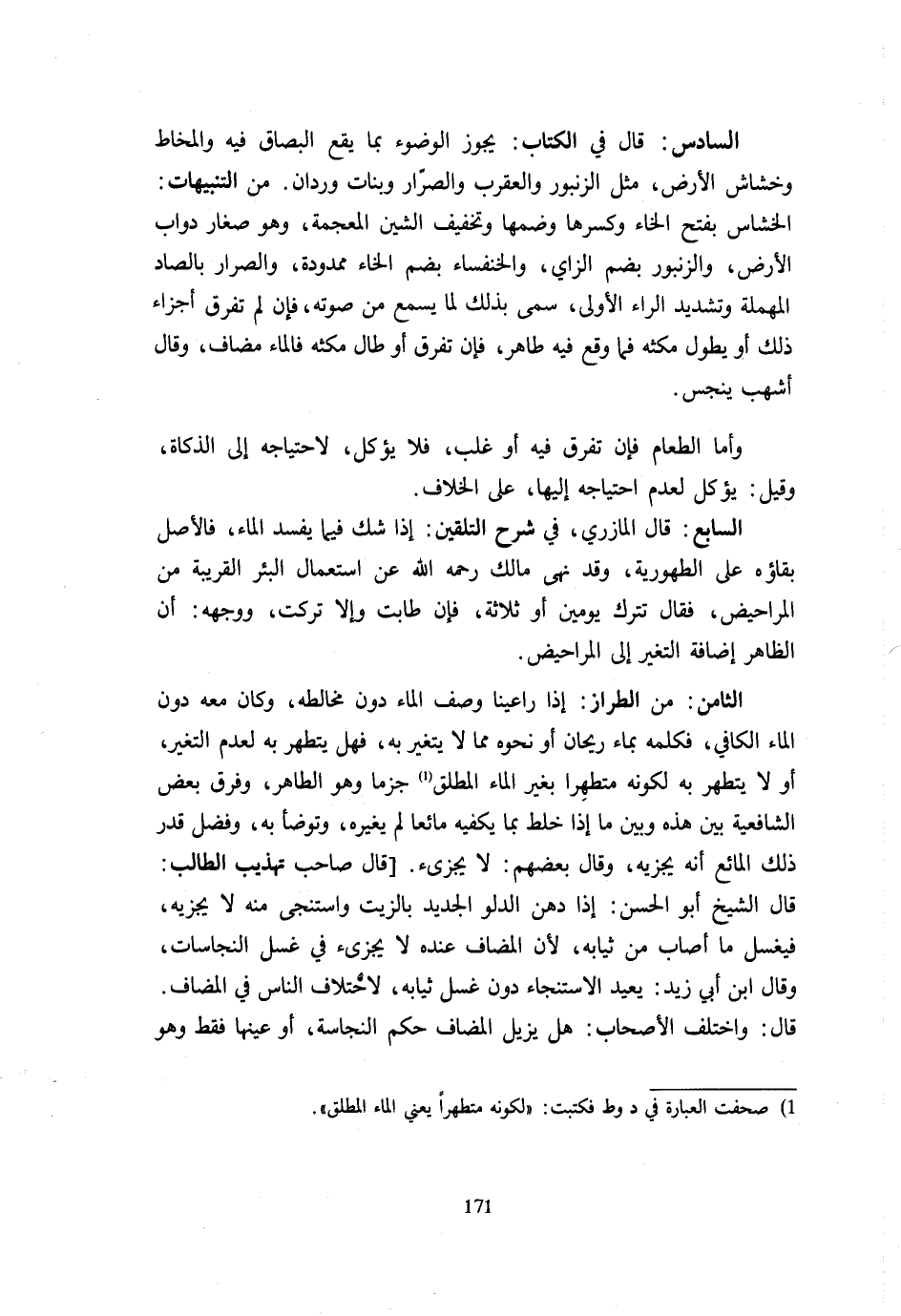 السَّادِسُ قَالَ فِي الْكِتَابِ يَجُوزُ الْوُضُوءُ بِمَا يَقَعُ الْبُصَاقُ فِيهِ وَالْمُخَاطُ وَخَشَاشُ الْأَرْضِ مِثْلُ الزُّنْبُورِ وَالْعَقْرَبِ وَالصَّرَّارِ وَبَنَاتِ وَرْدَانَ مِنَ التَّنْبِيهَاتِ الْخَشَاشُ بِفَتْحِ الْخَاءِ وَكَسْرِهَا وَضَمِّهَا وَتَخْفِيفِ الشِّينِ الْمُعْجَمَةِ وَهُوَ صِغَارُ دَوَابِّ الْأَرْضِ وَالزُّنْبُورِ بِضَمِّ الزَّايِ وَالْخُنْفُسَاءِ بِضَمِّ الْخَاءِ مَمْدُودَةً وَالصَّرَّارُ بِالصَّادِّ الْمُهْمَلَةِ وَتَشْدِيدِ الرَّاءِ الْأَوْلَى سُمِّيَ بِذَلِكَ لِمَا يُسْمَعُ مِنْ صَوْتِهِ فَإِنْ لَمْ تُفَرَّقْ أَجْزَاءُ ذَلِكَ أَوْ يَطُولُ مُكْثُهُ فَمَا وَقَعَ فِيهِ طَاهِرٌ فَإِنْ تَفَرَّقَ أَوْ طَالَ مُكْثُهُ فَالْمَاءُ مُضَافٌ وَقَالَ أَشْهَبُ يُنَجَّسُ. وَأَمَّا الطَّعَامُ فَإِنْ تَفَرَّقَ فِيهِ أَوْ غَلَبَ فَلَا يُؤْكَلُ لِاحْتِيَاجِهِ إِلَى الذَّكَاةِ وَقِيلَ يُؤْكَلُ لِعَدَمِ احْتِيَاجِهِ إِلَيْهَا عَلَى الْخِلَافِ. السَّابِعُ قَالَ الْمَازِرِيُّ فِي شَرْحِ التَّلْقِينِ إِذَا شُكَّ فِيمَا يُفْسِدُ الْمَاءَ فَالْأَصْلُ بَقَاؤُهُ عَلَى الطَّهُورِيَّةِ وَقَدْ نَهَى مَالِكٌ رَحِمَهُ اللَّهُ عَنِ اسْتِعْمَالِ الْبِئْرِ الْقَرِيبَةِ مِنَ الْمَرَاحِيضِ فَقَالَ تُتْرَكُ يَوْمَيْنِ أَوْ ثَلَاثَةً فَإِنْ طَابَتْ وَإِلَّا تُرِكَتْ وَوَجْهُهُ أَنَّ الظَّاهِرَ إِضَافَةُ التَّغَيُّرِ إِلَى الْمَرَاحِيضِ. الثَّامِنُ مِنَ الطَّرَّازِ إِذَا رَاعَيْنَا وَصْفَ الْمَاءِ دُونَ مُخَالِطِهِ وَكَانَ مَعَهُ دُونَ المَاء الْكَافِي فَكَلمهُ بِمَاءِ رَيْحَانٍ أَوْ نَحْوِهِ مِمَّا لَا يَتَغَيَّرُ بِهِ فَهَلْ يُتَطَهَّرُ بِهِ لِعَدَمِ التَّغَيُّرِ أَوْ لَا يُتَطَهَّرُ بِهِ لِكَوْنِهِ مُتَطَهِّرًا بِغَيْرِ الْمَاءِ الْمُطْلَقِ جَزْمًا وَهُوَ الطَّاهِرُ وَفَرَّقَ بَعْضُ الشَّافِعِيَّةِ بَيْنَ هَذِهِ وَبَيْنَ مَا إِذَا خُلِطَ بِمَا يَكْفِيهِ مَائِعًا لَمْ يُغَيِّرْهُ وَتَوَضَّأَ بِهِ وَفَضَلَ قَدْرُ ذَلِكَ الْمَائِعِ أَنَّهُ يُجْزِيهِ وَقَالَ بَعْضُهُمْ لَا يُجْزِئُ قَالَ صَاحِبُ تَهْذِيبِ الطَّالِبِ قَالَ الشَّيْخُ أَبُو الْحَسَنِ إِذَا دَهَنَ الدَّلْوَ الْجَدِيدَ بِالزَّيْتِ وَاسْتَنْجَى مِنْهُ لَا يَجْزِيهِ فَيَغْسِلُ مَا أَصَابَ مِنْ ثِيَابِهِ لِأَنَّ الْمُضَافَ عِنْدَهُ لَا يُجْزِئُ فِي غَسْلِ النَّجَاسَاتِ وَقَالَ ابْنُ أَبِي زَيْدٍ يُعِيدُ الِاسْتِنْجَاءَ دُونَ غَسْلِ ثِيَابِهِ لِاخْتِلَافِ النَّاسِ فِي الْمُضَافِ قَالَ وَاخْتَلَفَ الْأَصْحَابُ هَلْ يُزِيلُ الْمُضَافُ حُكْمَ النَّجَاسَةِ أَوْ عَيْنَهَا فَقَطْ وَهُوَ